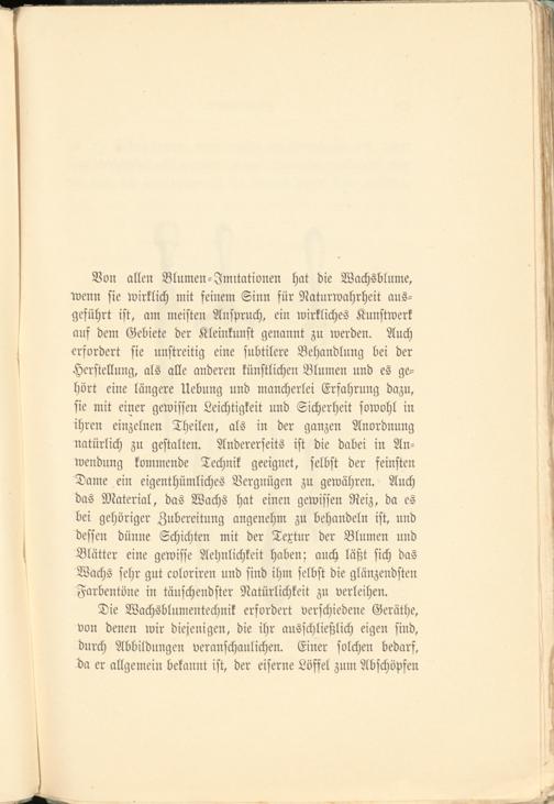 Von allen Blumen-Imitationen hat die Wachsblume, Nenn sie wirklich mit feinem Sinn für Naturwahrheit ausgeführt ist, am meisten Anspruch, ein wirkliches Kunstwerk auf dem Gebiete der Kleinkunst genannt zu werden. Auch erfordert sie unstreitig eine subtilere Behandlung bei der Herstellung, als alle anderen künstlichen Blumen und es gehört eine längere Uebung und mancherlei Erfahrung dazu, sie mit einer gewissen Leichtigkeit und Sicherheit sowohl in ihren einzelnen Theilen, als in der ganzen Anordnung natürlich zu gestalten. Andererseits ist die dabei in Anwendung kommende Technik geeignet, selbst der feinsten Dame ein eigenthümliches Vergnügen zu gewähren. Auch das Material, das Wachs hat einen gewissen Reiz, da es bei gehöriger Zubereitung angenehm zu behandeln ist, und dessen dünne Schichten mit der Textur der Blumen und Blätter eine gewisse Aehnlichkeit haben; auch läßt sich das Wachs sehr gut coloriren und sind ihm selbst die glänzendsten Farbentöne in täuschendster Natürlichkeit zu verleihen.