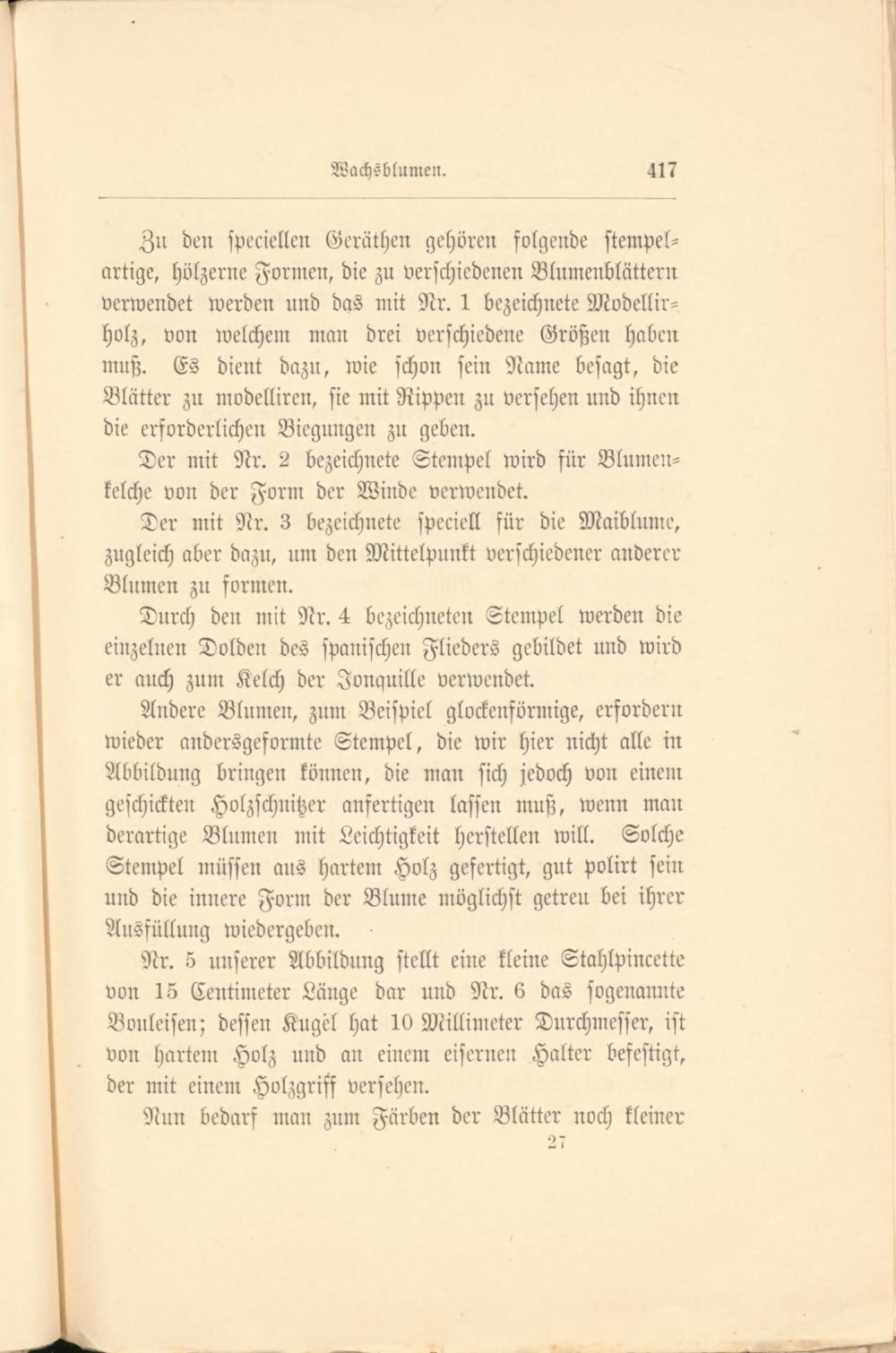 Andere Blumen, zum Beispiel glockenförmige, erfordern wieder andersgeformte Stempel, die wir hier nicht alle in Abbildung bringen können, die man sich jedoch von einem geschickten Holzschnitzer anfertigen lassen muß, wenn man derartige Blumen mit Leichtigkeit herstellen will. Solche Stempel müssen aus hartem Holz gefertigt, gut polirt sein und die innere Form der Blume möglichst getreu bei ihrer Ausfüllung wiedergeben.