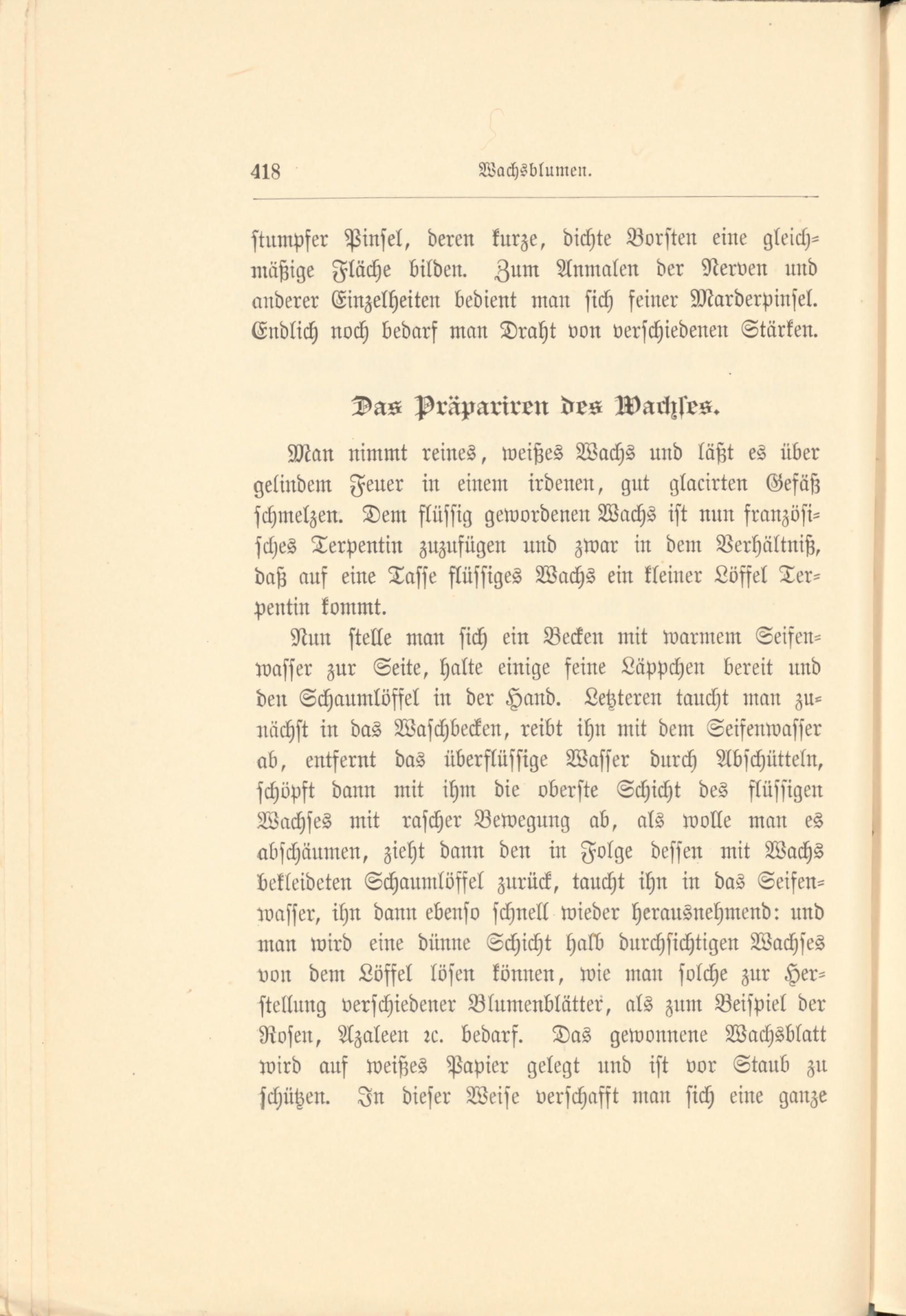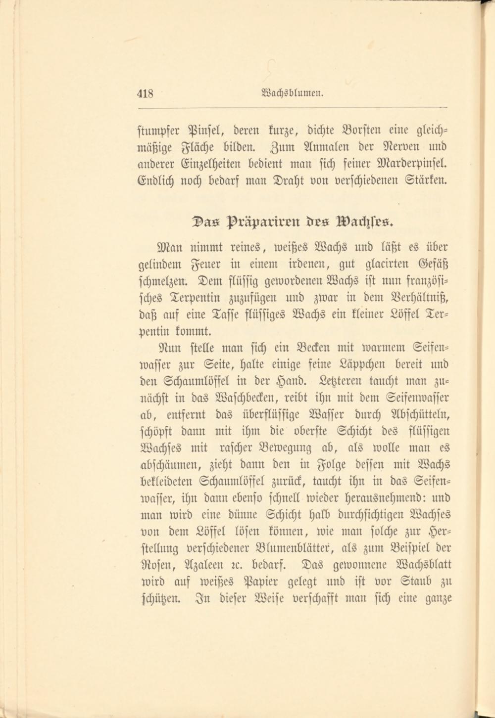 Nun stelle man sich ein Becken mit warmem Seifen- wasser zur Seite, halte einige feine Läppchen bereit und den Schaumlöffel in der Hand. Letzteren taucht man zunächst in das Waschbecken, reibt ihn mit dem Seisenwasser ab, entfernt das überflüssige Wasser durch Abschütteln, schöpft dann mit ihm die oberste Schicht des flüssigen Wachses mit rascher Bewegung ab, als wolle man es abschäumen, zieht dann den in Folge dessen mit Wachs bekleideten Schaumlöffel zurück, taucht ihn in das Seifen- wasser, ihn dann ebenso schnell wieder herausnehmend: und man wird eine dünne Schicht halb durchsichtigen Wachses von dem Löffel lösen können, wie man solche zur Herstellung verschiedener Blumenblätter, als zum Beispiel der Rosen, Azaleen rc. bedarf. Das gewonnene Wachsblatt wird auf weißes Papier gelegt und ist vor Staub zu schützen. In dieser Weise verschafft man sich eine ganze