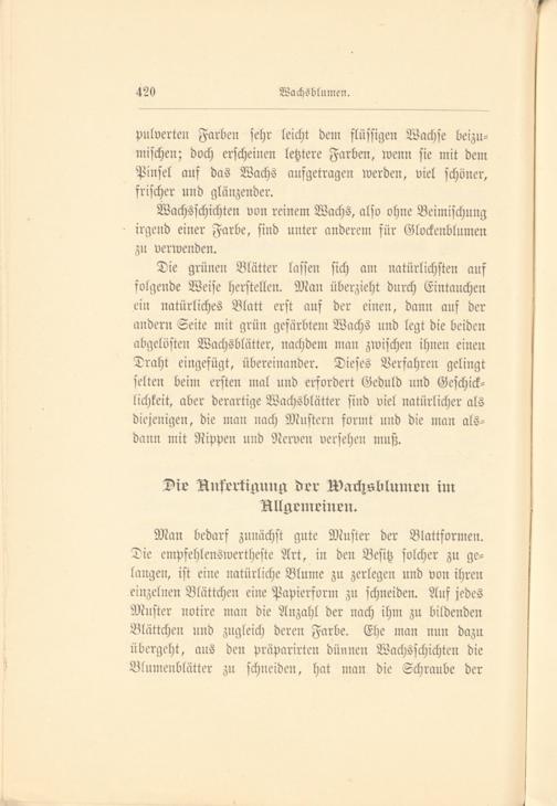 Die grünen Blätter lassen sich am natürlichsten auf folgende Weise herstellen. Man überzieht durch Eintauchen ein natürliches Blatt erst auf der einen, dann auf der andern Seite mit grün gefärbtem Wachs und legt die beiden abgelösten Wachsblätter, nachdem man zwischen ihnen einen Draht eingefügt, übereinander. Dieses Verfahren gelingt selten beim ersten mal und erfordert Geduld und Geschick- lichkeit, aber derartige Wachsblätter sind viel natürlicher als diejenigen, die man nach Mustern formt und die man alsdann mit Rippen und Nerven versehen muß.