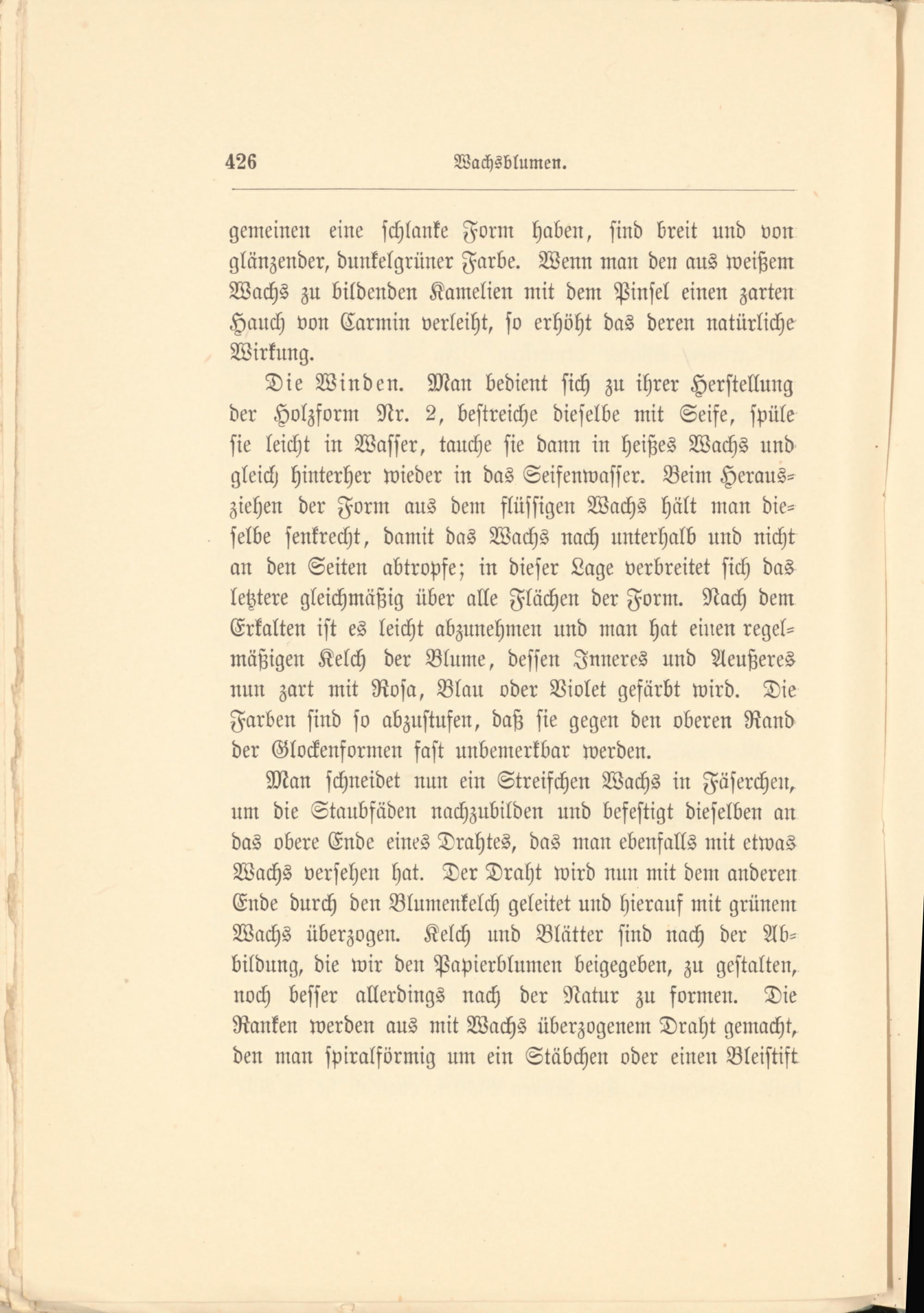Man schneidet nun ein Streifchen Wachs in Fäserchen, um die Staubfäden nachzubilden und befestigt dieselben an das obere Ende eines Drahtes, das man ebenfalls mit etwas Wachs versehen hat. Der Draht wird nun mit dem anderen Ende durch den Blumenkelch geleitet und hierauf mit grünem Wachs überzogen. Kelch und Blätter sind nach der Abbildung, die wir den Papierblumen beigegeben, zu gestalten, noch besser allerdings nach der Natur zu formen. Die Ranken werden aus mit Wachs überzogenem Draht gemacht, den man spiralförmig um ein Stäbchen oder einen Bleistift