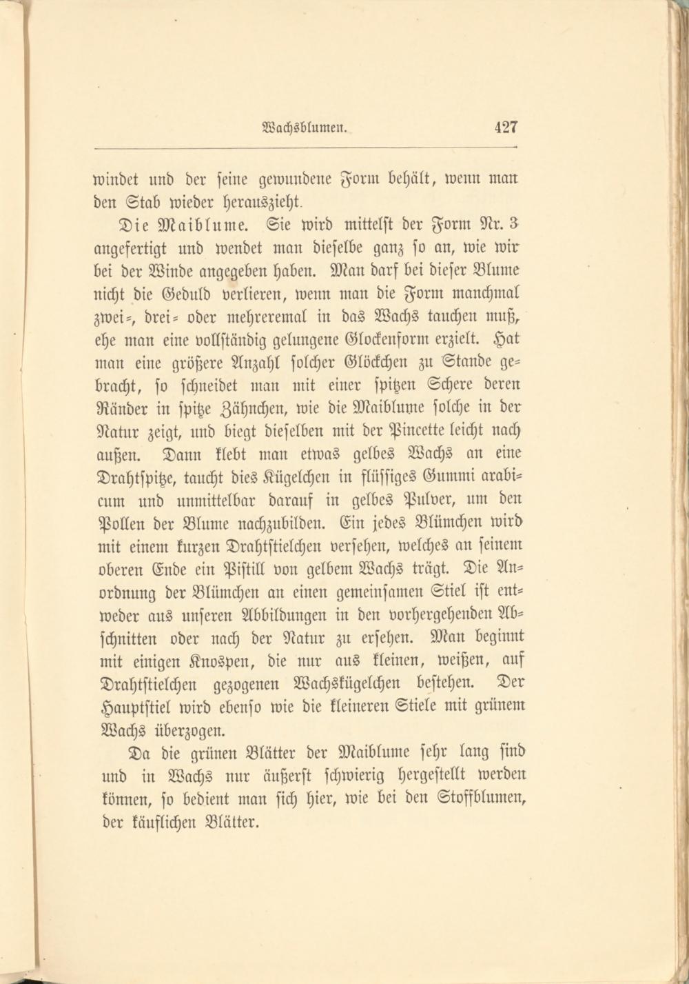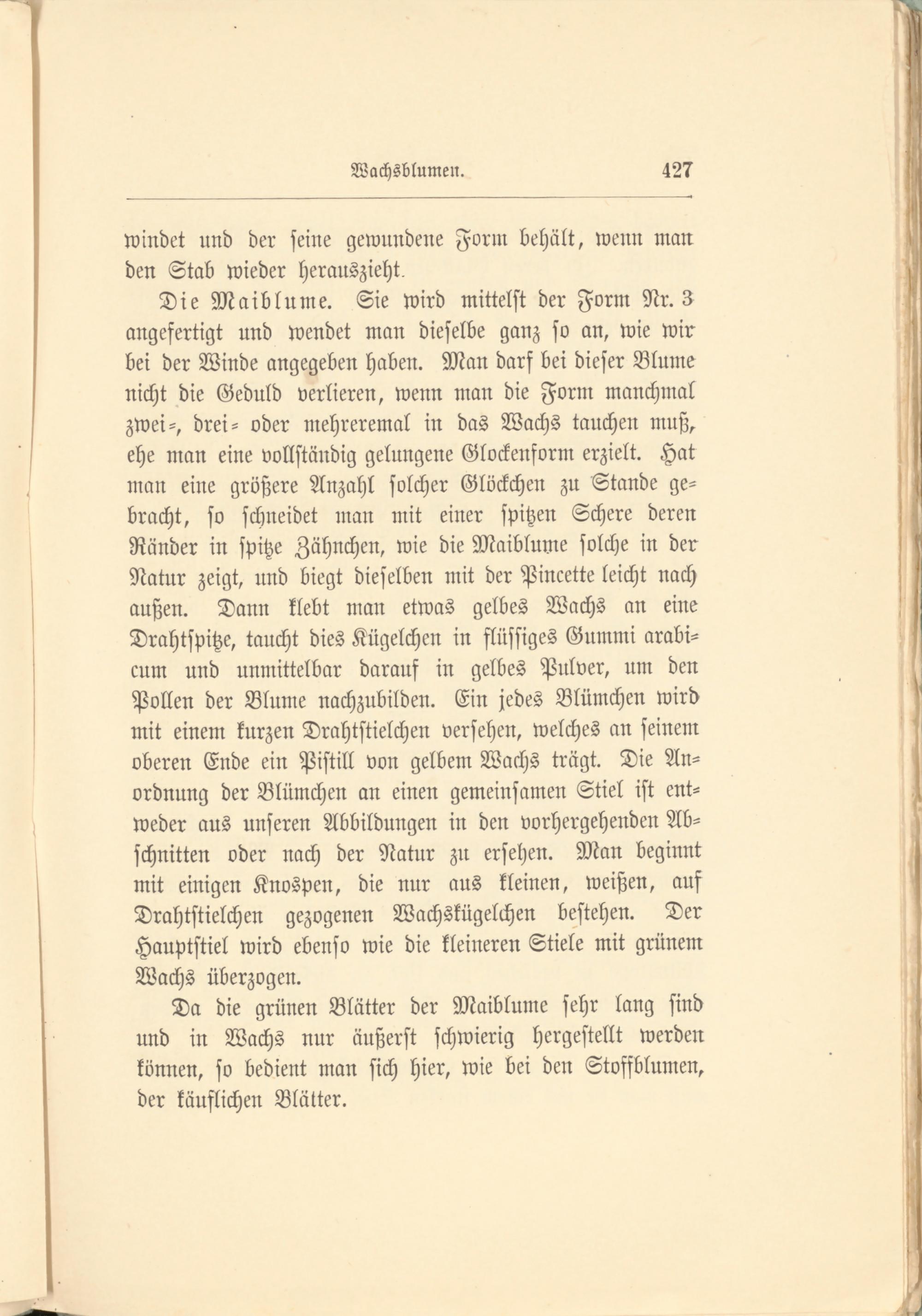 Da die grünen Blätter der Maiblume sehr lang sind und in Wachs nur äußerst schwierig hergestellt werden können, so bedient man sich hier, wie bei den Stoffblumen, der käuflichen Blätter.