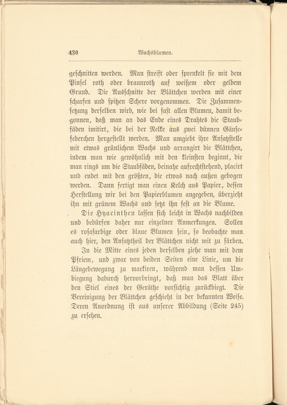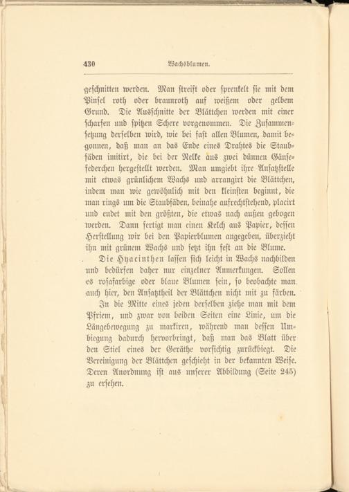 In die Mitte eines jeden derselben ziehe man mit dem Pfriem, und zwar von beiden Seiten eine Linie, um die Längebewegung zu markiren, während man dessen Um- biegung dadurch hervorbringt, daß man das Blatt über den Stiel eines der Geräthe vorsichtig zurückbiegt. Die Vereinigung der Blättchen geschieht in der bekannten Weise. Deren Anordnung ist aus unserer Abbildung (Seite 245) M ersehen.