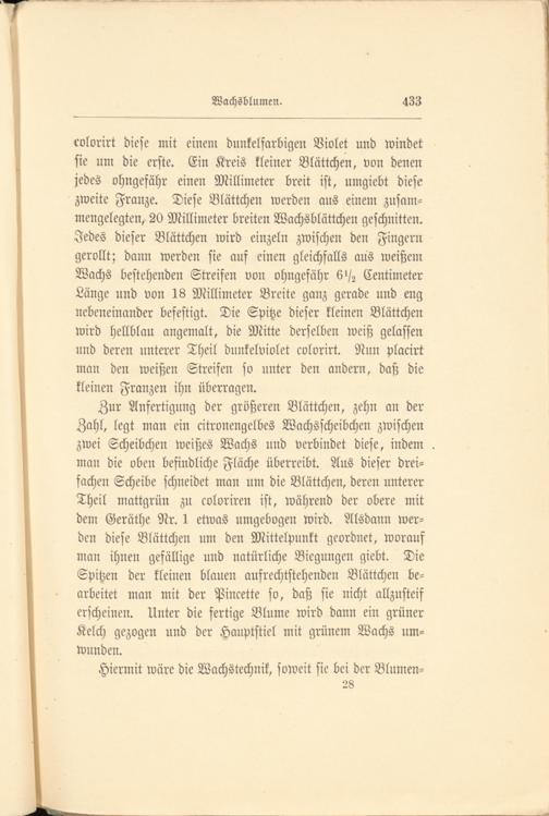 colorirt diese mit einem dunkelfarbigen Violet und windet sie um die erste. Ein Kreis kleiner Blättchen, von denen jedes ohngefähr einen Millimeter breit ist, umgiebt diese zweite Franze. Diese Blättchen werden aus einem zusammengelegten, 20 Millimeter breiten Wachsblättchen geschnitten. Jedes dieser Blättchen wird einzeln zwischen den Fingern gerollt; dann werden sie auf einen gleichfalls aus weißem Wachs bestehenden Streifen von ohngefähr 6^ Centimeter Länge und von 18 Millimeter Breite ganz gerade und eng nebeneinander befestigt. Die Spitze dieser kleinen Blättchen wird hellblau angemalt, die Mitte derselben weiß gelassen und deren unterer Theil dunkelviolet colorirt. Nun placirt man den weißen Streifen so unter den andern, daß die kleinen Franzen ihn überragen.