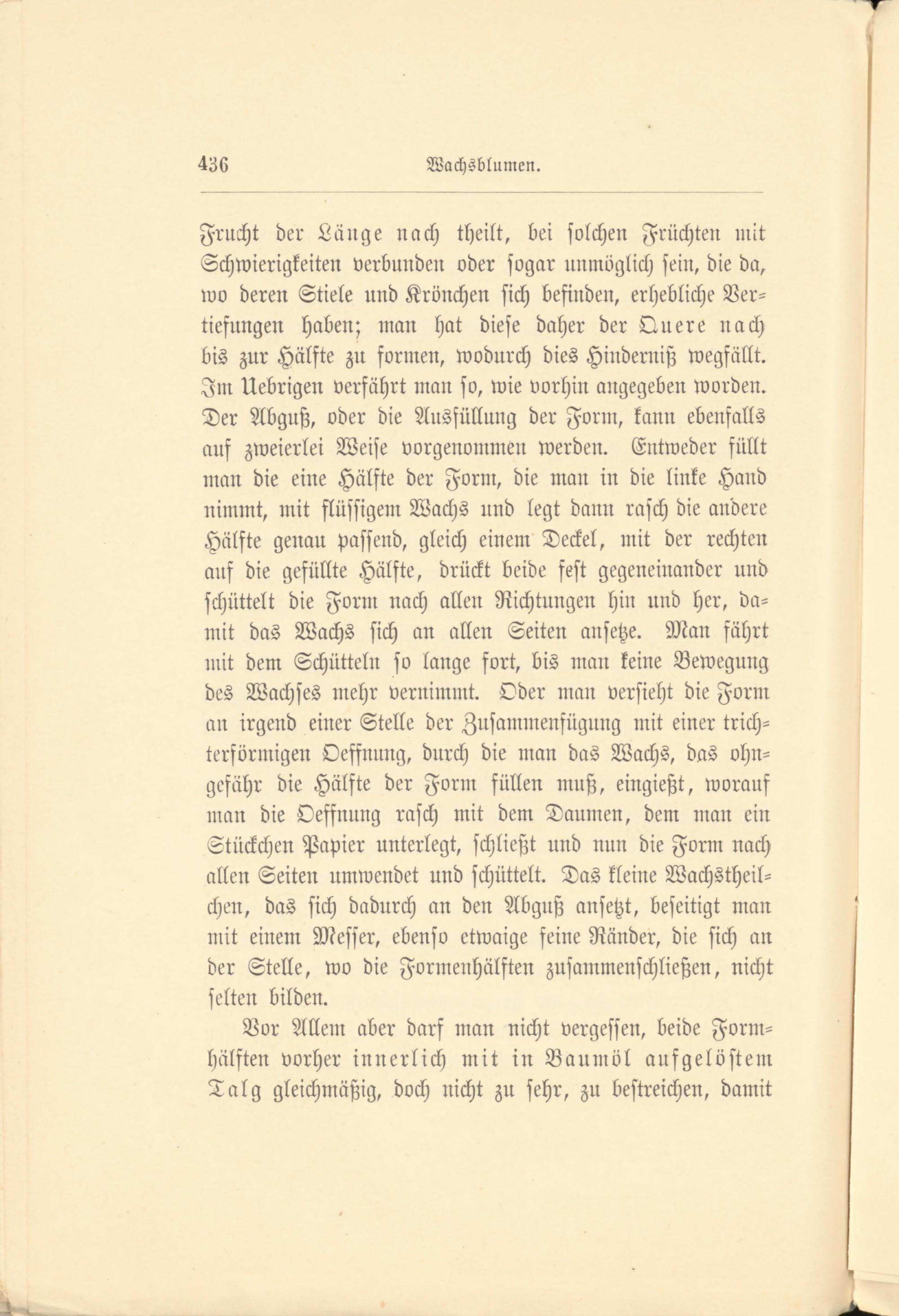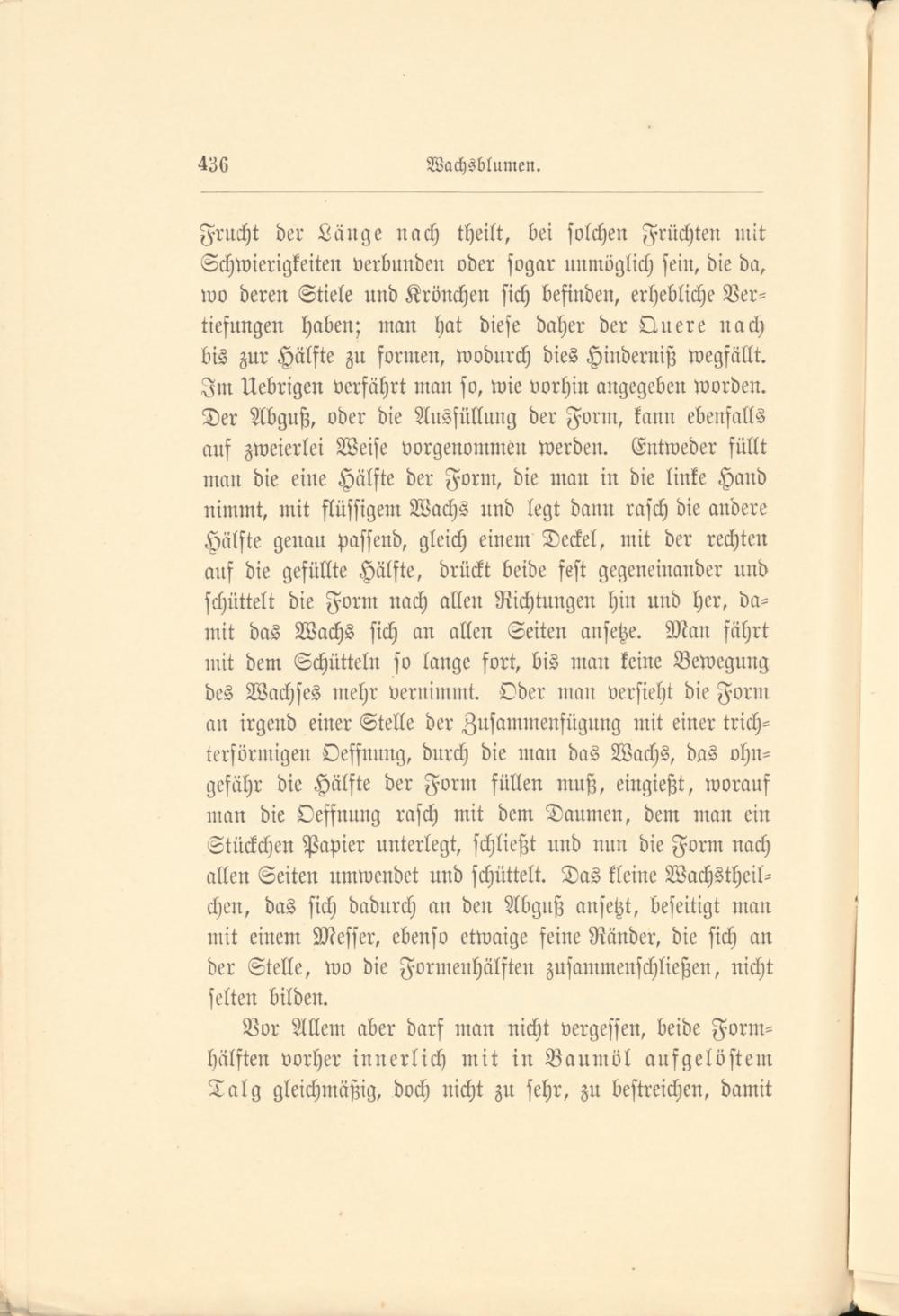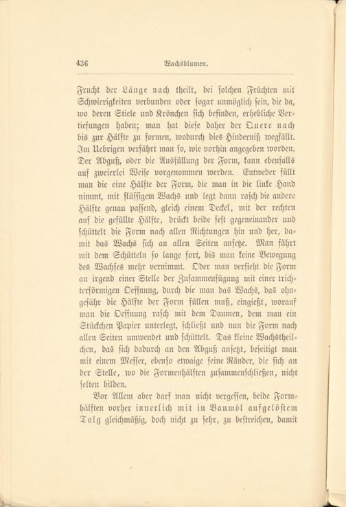 Frucht der Länge nach theilt, bei solchen Früchten mit Schwierigkeiten verbunden oder sogar unmöglich sein, die da, wo deren Stiele und Krönchen sich befinden, erhebliche Vertiefungen haben; man hat diese daher der Quere nach bis zur Hälfte zu formen, wodurch dies Hinderniß wegfällt. Im Uebrigen verfährt man so, wie vorhin angegeben worden. Der Abguß, oder die Ausfüllung der Form, kann ebenfalls auf zweierlei Weise vorgenommen werden. Entweder füllt man die eine Hälfte der Form, die man in die linke Hand nimmt, mit flüssigem Wachs und legt dann rasch die andere Hälfte genau passend, gleich einem Deckel, mit der rechten auf die gefüllte Hälfte, drückt beide fest gegeneinander und schüttelt die Form nach allen Richtungen hin und her, damit das Wachs sich an allen Seiten ansetze. Man führt mit dem Schütteln so lange fort, bis man keine Bewegung des Wachses mehr vernimmt. Oder man versieht die Form an irgend einer Stelle der Zusaminenfügung mit einer trichterförmigen Oefsnung, durch die man das Wachs, das ohn- gefähr die Hälfte der Form füllen muß, eingießt, worauf man die Oeffnung rasch mit dem Daumen, dem man ein Stückchen Papier unterlegt, schließt und nun die Form nach allen Seiten umwendet und schüttelt. Das kleine Wachstheil- chen, das sich dadurch an den Abguß ansetzt, beseitigt man mit einem Messer, ebenso etwaige feine Ränder, die sich an der Stelle, wo die Formenhälften zusammenschließen, nicht selten bilden.