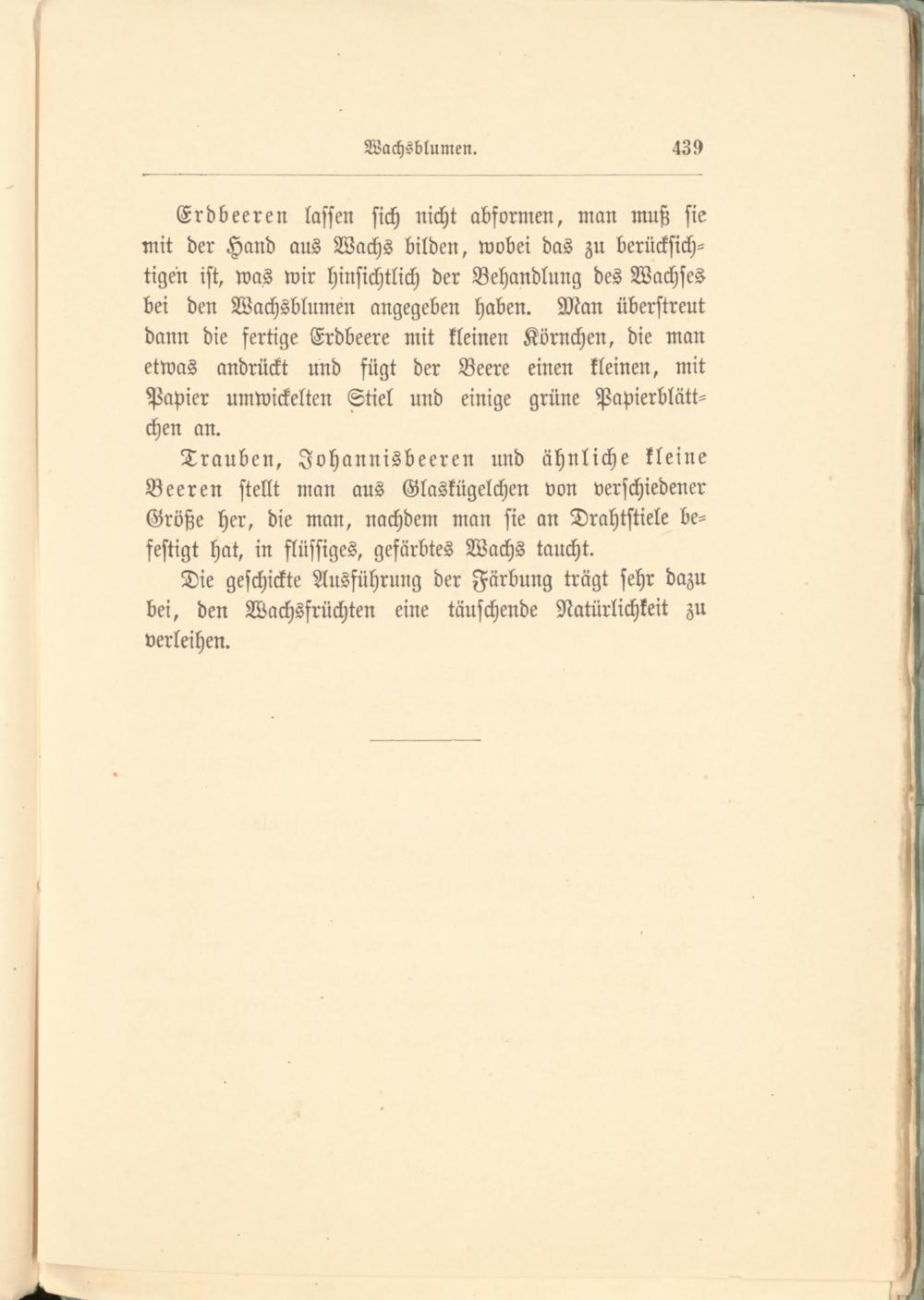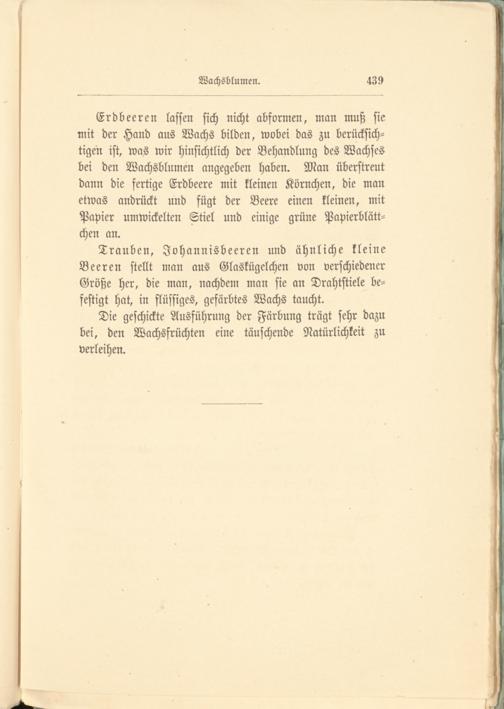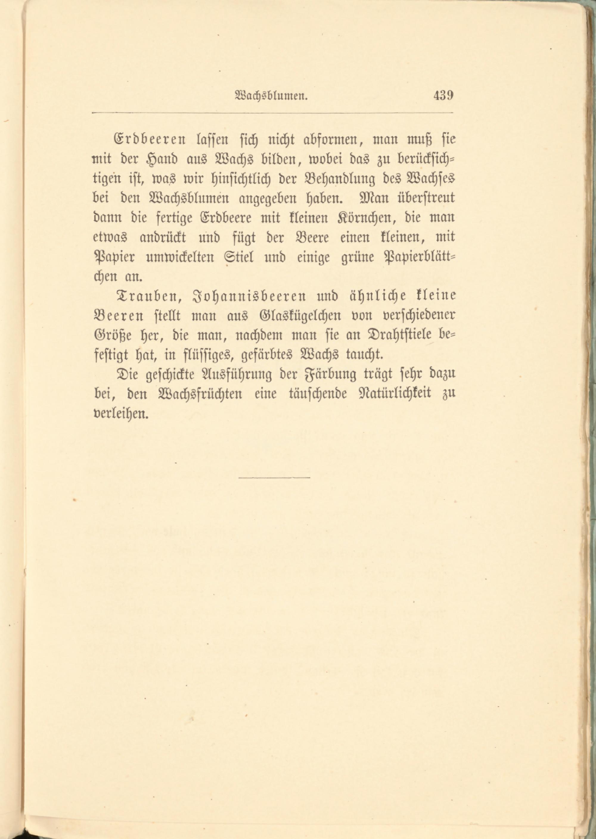 Erdbeeren lassen sich nicht abformen, man muß sie mit der Hand aus Wachs bilden, wobei das zu berücksichtigen ist, was wir hinsichtlich der Behandlung des Wachses bei den Wachsblumen angegeben haben. Man überstreut dann die fertige Erdbeere mit kleinen Körnchen, die man etwas andrückt und fügt der Beere einen kleinen, mit Papier umwickelten Stiel und einige grüne Papierblätt- chen an.