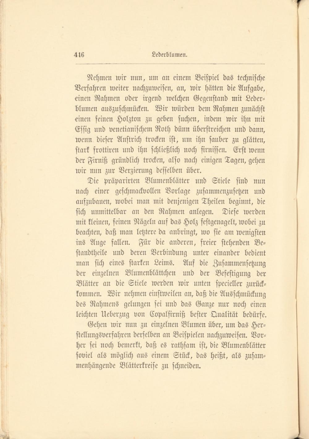 Nehmen wir nun, um an einem Beispiel das technische Verfahren weiter nachzuweisen, an, wir hätten die Aufgabe, einen Rahmen oder irgend welchen Gegenstand mit Lederblumen auszuschmücken. Wir würden dem Rahmen zunächst einen feinen Holzton zu geben suchen, indem wir ihn mit Essig und venetianischem Roth dünn überstreichen und dann, wenn dieser Anstrich trocken ist, um ihn sauber zu glätten, stark frottiren und ihn schließlich noch firnissen. Erst wenn der Firniß gründlich trocken, also nach einigen Tagen, gehen wir nun zur Verzierung desselben über.