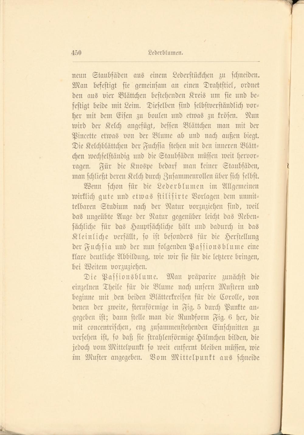 Wenn schon für die Lederblnmen im Allgemeinen Wirklich gute und etwas stilisirte Vorlagen dem unmittelbaren Studium nach der Natur vorzuziehen sind, weil das ungeübte Auge der Natur gegenüber leicht das Nebensächliche für das Hauptsächliche hält und dadurch in das Kleinliche verfällt, so ist besonders für die Herstellung der Fuchsia und der nun folgenden Passionsblume eine klare deutliche Abbildung, wie wir sie für die letztere bringen, bei Weitem vorzuziehen.