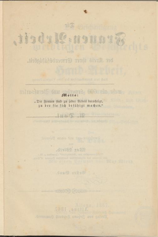 Die Beschäftigung des weiblichen Geschlechts in der Hand-Arbeit oder praktische Nachweisung der Thätigkeit der Frauen im Haushalte, im Verkehr, in der Klein- und Groß-Industrie, in den verschiedenen Gewerben, selbstständigen Erwerbsarten, und den zunächst damit verbundenen Absatz-Geschäften / von A. Daul. Mit einem Vorwort von Max Wirth