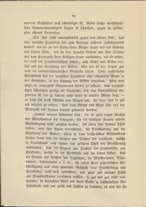 „Immer werden Stimmen laut, die in ganz engen Kreisen des Mittelstandes sich bewegend, für die heutigen Frauen andere Beschäftigung nicht zulassen wollen, als einen sehr kleinen Theil dessen, was ihre Ahnen verrichteten, die Haushaltung und die Erziehung der Kinder; allein in dem beschränkten Gesichtskreis solcher Leute sind die Frauen und Töchter der Landleute, welche in Deutschland noch immer den größern Theil der Bevölkerung ausmachen, sind die Frauen und Töchter der Handwerker und Kaufleute, welche in der Werkstätte und im Laden helfen, sind die Frauen und Töchter der Taglöhner, die Wäscherinnen, Näherinnen, Lehrerinnen u. s. w., die neben ihrer gewerblichen Beschäftigung das oben genannte Geschäft (der Haushaltung und Erziehung) auch noch verrichten, und zwar mit weniger Hülfe als Beamtenfrauen verrichten müssen, so gut wie gar nicht vorhanden ; sie betrachten Alles mit ihrer Brille in beschränktem Gesichtskreis, und um gleich mit Zahlen zu kommen, es sind für sie