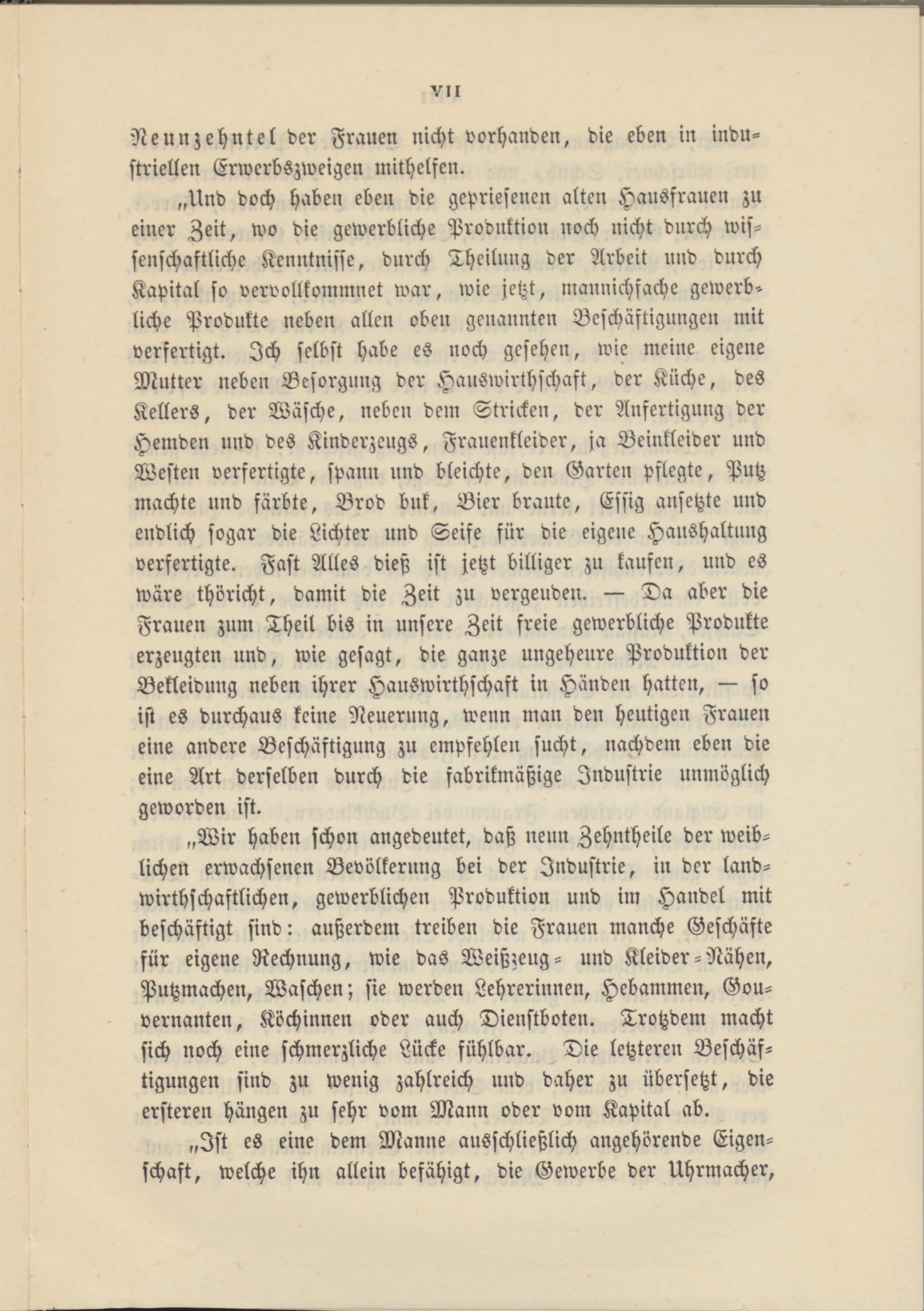 „Und doch haben eben die gepriesenen alten Hausfrauen zu einer Zeit, wo die gewerbliche Produktion noch nicht durch wissenschaftliche Kenntnisse, durch Theilung der Arbeit und durch Kapital so vervollkommnet war, wie jetzt, mannichfache gewerbliche Produkte neben allen oben genannten Beschäftigungen mit verfertigt. Ich selbst habe es noch gesehen, wie meine eigene Mutter neben Besorgung der Hauswirthschaft, der Küche, des Kellers, der Wäsche, neben dem Stricken, der Anfertigung der Hemden und des Kinderzeugs, Frauenkleider, ja Beinkleider und Westen verfertigte, spann und bleichte, den Garten pflegte, Putz machte und färbte, Brod buk, Bier braute, Essig ansetzte und endlich sogar die Lichter und Seife für die eigene Haushaltung verfertigte. Fast Alles dieß ist jetzt billiger zu kaufen, und es wäre thöricht, damit die Zeit zu vergeuden. — Da aber die Frauen zum Theil bis in unsere Zeit freie gewerbliche Produkte erzeugten und, wie gesagt, die ganze ungeheure Produktion der Bekleidung neben ihrer Hauswirthschaft in Händen hatten, — so ist es durchaus keine Neuerung, wenn man den heutigen Frauen eine andere Beschäftigung zu empfehlen sucht, nachdem eben die eine Art derselben durch die fabrikmäßige Industrie unmöglich geworden ist.