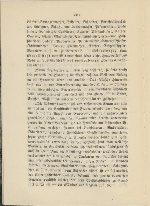 „Wenn dieß letztere fast jeden Tag geschieht, so steht gewiß kein principielles Hinderniß im Wege, daß das Weib von Anfang an ein Handwerk lerne und ausübe. Das faktische Hinderniß liegt nur in der Gewerbeordnung mancher Länder. — In dem neuen österreichischen Gewerbegesetz ist dem weiblichen Geschlecht volle Gewerbefreiheit zugesichert und das gleiche ist in Baden, Sachsen, Nassau und anderen deutschen Ländern geschehen.