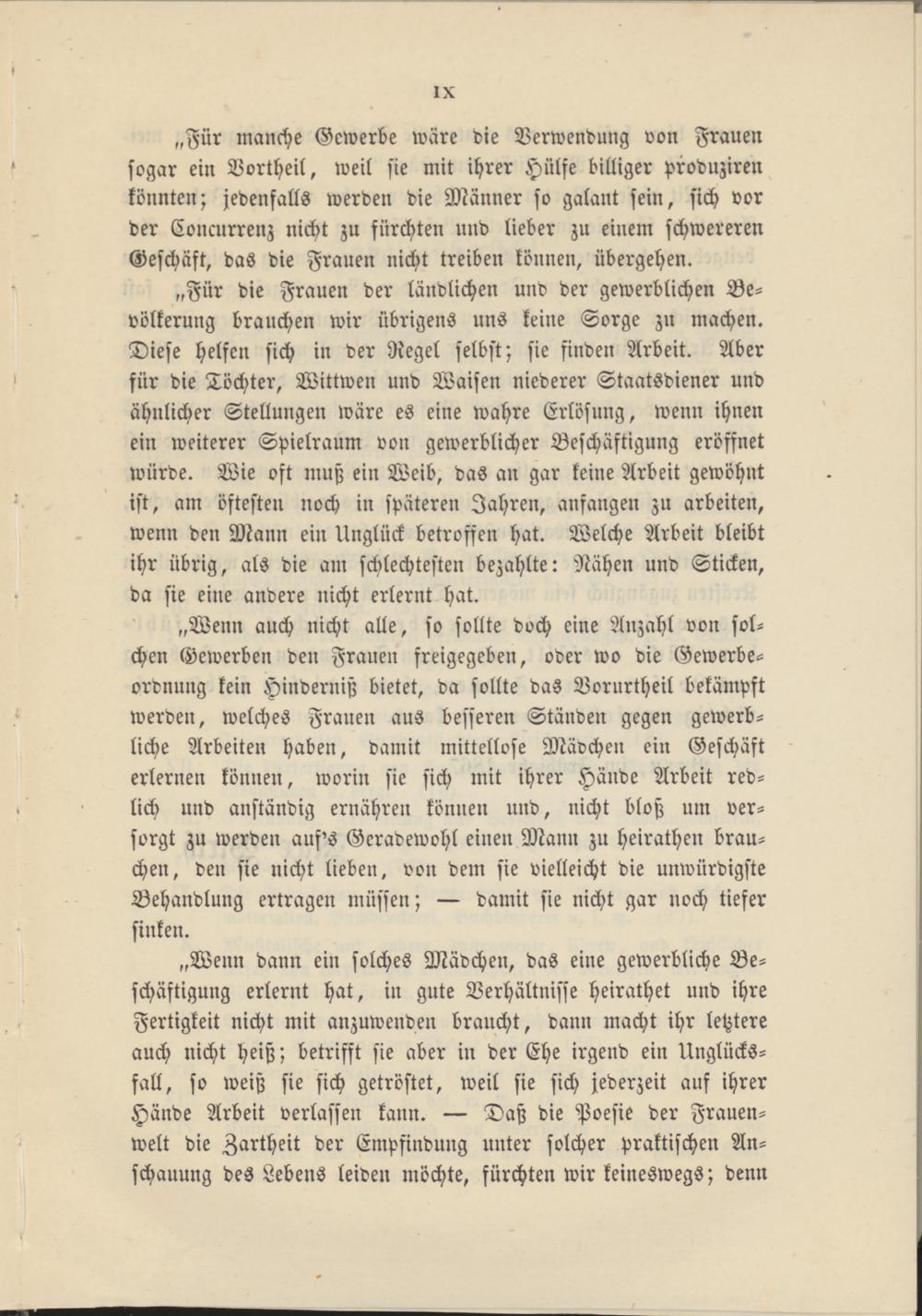 „Wenn auch nicht alle, so sollte doch eine Anzahl von solchen Gewerben den Frauen freigegeben, oder wo die Gewerbeordnung kein Hinderniß bietet, da sollte das Vorurtheil bekämpft werden, welches Frauen aus besseren Ständen gegen gewerbliche Arbeiten haben, damit mittellose Mävchen ein Geschäft erlernen können, worin sie sich mit ihrer Hände Arbeit redlich und anständig ernähren können und, nicht bloß um versorgt zu werden auf's Geradewohl einen Mann zu heirathen brauchen, den sie nicht lieben, von dem sie vielleicht die unwürdigste Behandlung ertragen müssen; — damit sie nicht gar noch tiefer sinken.