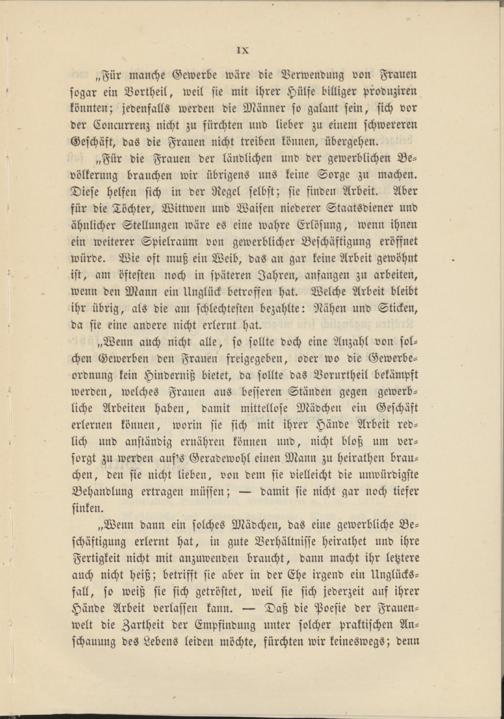 „Für die Frauen der ländlichen und der gewerblichen Bevölkerung brauchen wir übrigens uns keine Sorge zu machen. Diese helfen sich in der Regel selbst; sie finden Arbeit. Aber für die Töchter, Wittwen und Waisen niederer Staatsdiener und ähnlicher Stellungen wäre es eine wahre Erlösung, wenn ihnen ein weiterer Spielraum von gewerblicher Beschäftigung eröffnet würde. Wie oft muß ein Weib, das an gar keine Arbeit gewöhnt ist, am öftesten noch in späteren Jahren, anfangen zu arbeiten, wenn den Mann ein Unglück betroffen hat. Welche Arbeit bleibt ihr übrig, als die am schlechtesten bezahlte: Nähen und Sticken, da sie eine andere nicht erlernt hat.