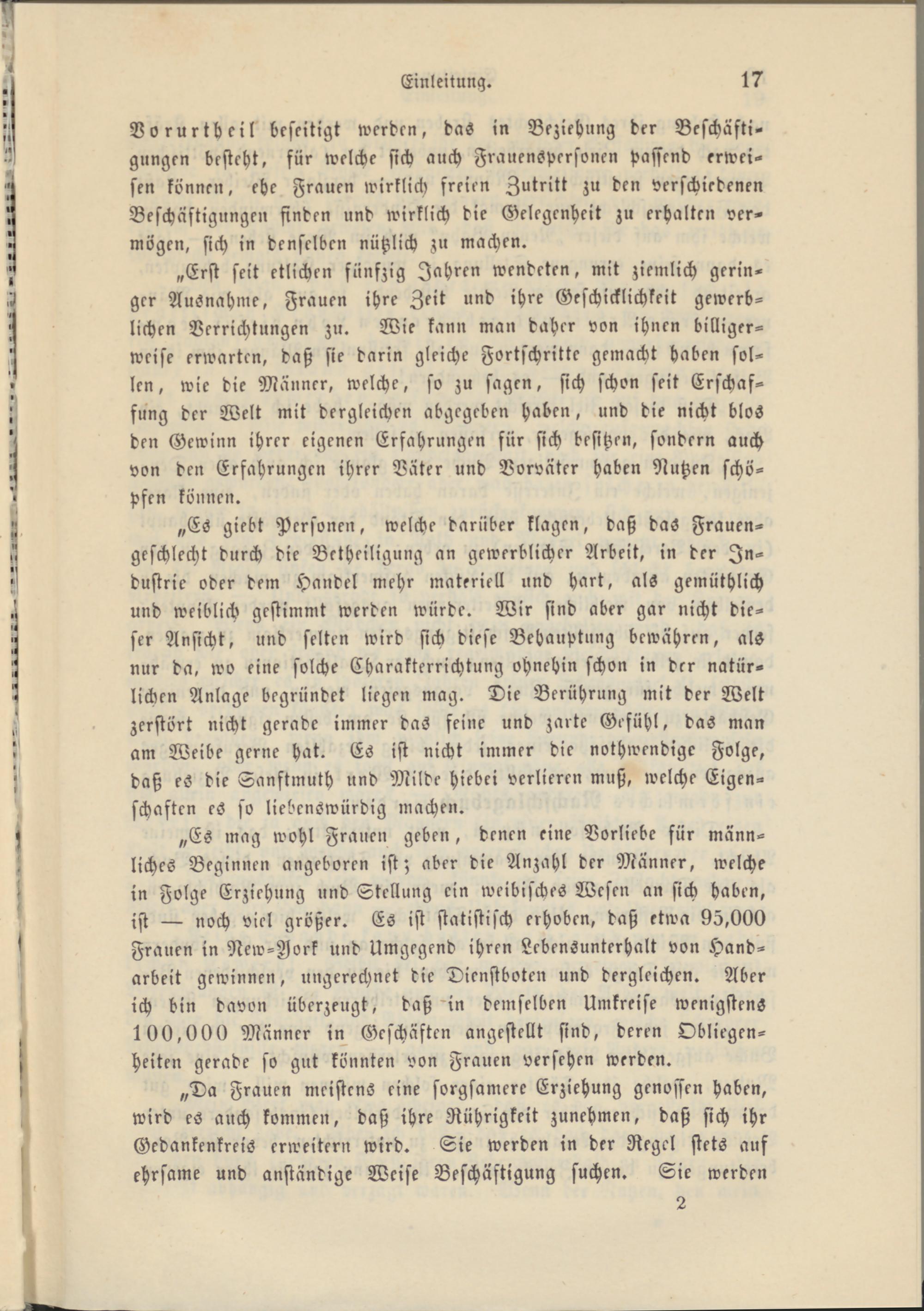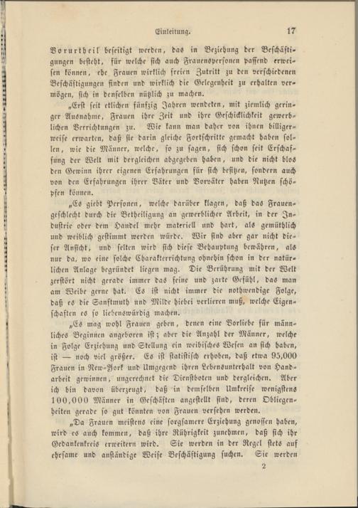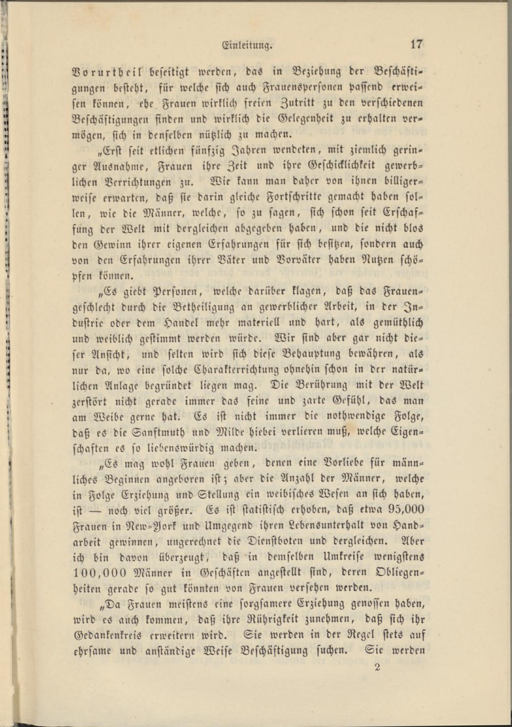 „Es giebt Personen, welche darüber klagen, daß das Frauen- geschlecht durch die Betheiligung an gewerblicher Arbeit, in der Industrie oder dem Handel mehr materiell und hart, als gemüthlich und weiblich gestimmt werden würde. Wir sind aber gar nicht dieser Ansicht, und selten wird sich diese Behauptung bewähren, als nur da, wo eine solche Charakterrichtung ohnehin schon in der natürlichen Anlage begründet liegen mag. Die Berührung mit der Welt zerstört nicht gerade immer das feine und zarte Gefühl, das man am Weibe gerne hat. Es ist nicht immer die nothwendige Folge, daß es die Sanftmuth und Milde hiebci verlieren muß, welche Eigenschaften es so liebenswürdig machen.