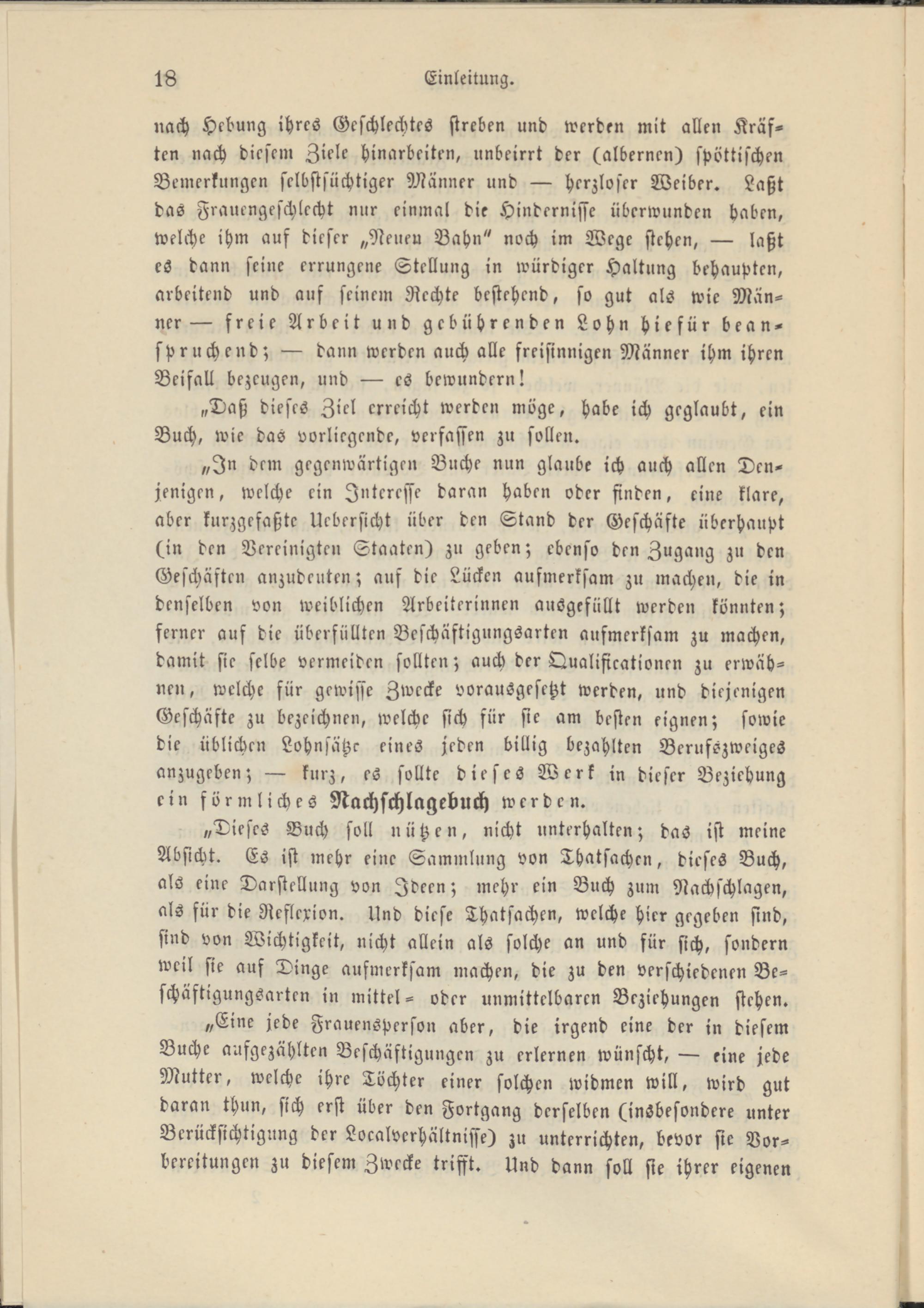 „In dem gegenwärtigen Buche nun glaube ich auch allen Denjenigen, welche ein Interesse daran haben oder finden, eine klare, aber kurzgefaßte Uebersicht über den Stand der Geschäfte überhaupt (in den Vereinigten Staaten) zu geben; ebenso den Zugang zu den Geschäften anzudeuten; auf die Lücken aufmerksam zu machen, die in denselben von weiblichen Arbeiterinnen ausgefüllt werden könnten; ferner auf die überfüllten Beschäftigungsarten aufmerksam zu machen, damit sie selbe vermeiden sollten; auch der Qualifikationen zu erwähnen, welche für gewisse Zwecke vorausgesetzt werden, und diejenigen Geschäfte zu bezeichnen, welche sich für sie am besten eignen; sowie die üblichen Lohnsätze eines jeden billig bezahlten Berufszweiges anzugeben; — kurz, es sollte dieses Werk in dieser Beziehung ein förmliches Nachschlagebuch werden.