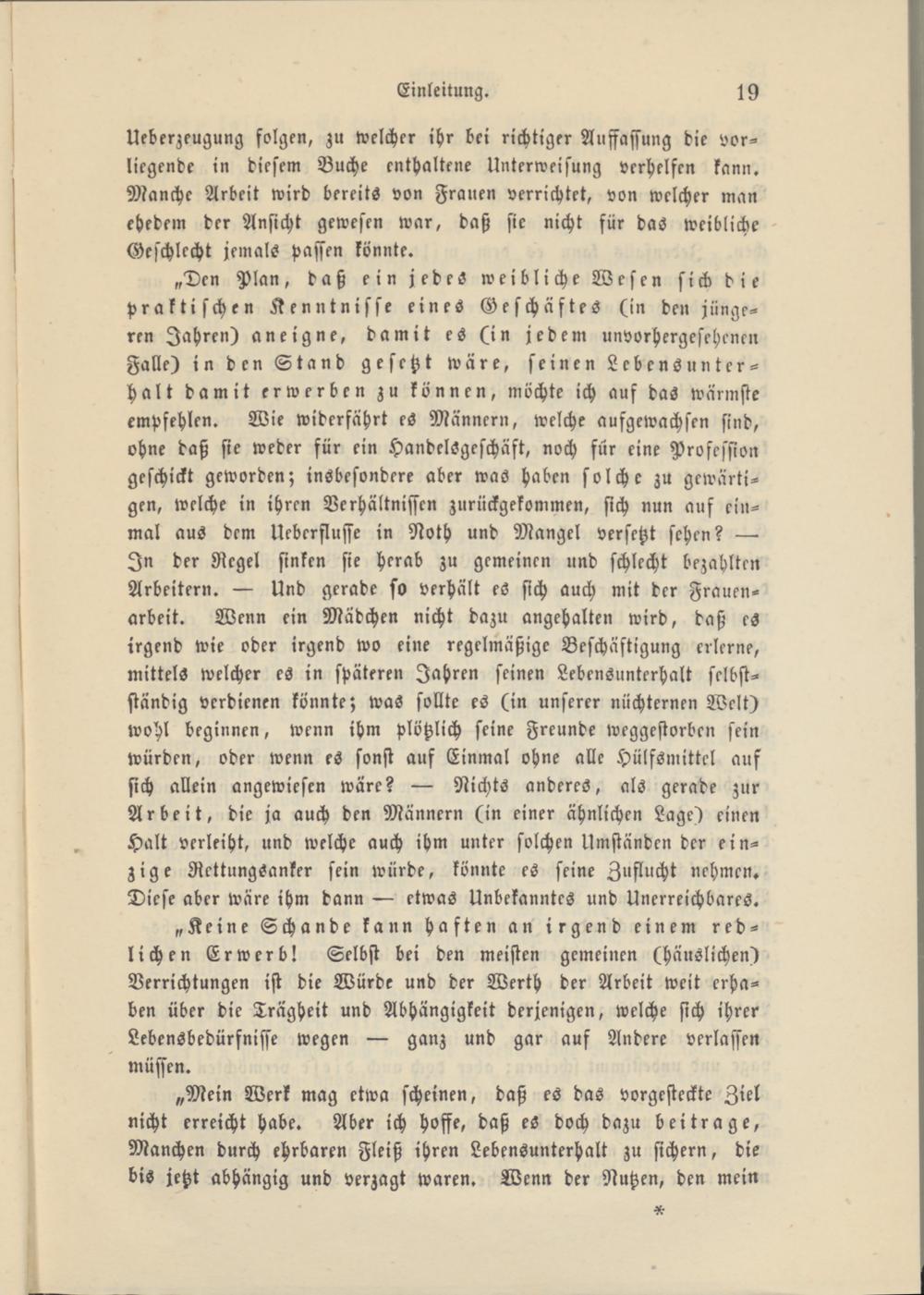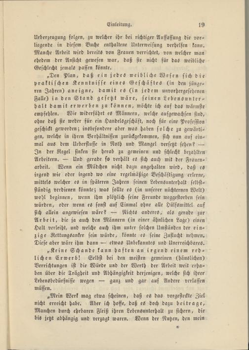 „Den Plan, daß ein jedes weibliche Wesen sick die praktischen Kenntnisse eines Geschäftes (in den jüngeren Jahren) aneigne, damit es (in jedem unvorhergesehenen Falle) in den Stand gesetzt wäre, seinen Lebensunterhalt damit erwerben zu können, möchte ich auf das wärmste empfehlen. Wie widerfährt es Männern, welche aufgewachsen sind, ohne daß sie weder für ein Handelsgeschäft, noch für eine Profession geschickt geworden; insbesondere aber was haben solche zu gewärtigen, welche in ihren Verhältnissen zurückgekommen, sich nun auf einmal aus dem Uebcrflusse in Noth und Mangel versetzt sehen? — In der Regel sinken sie herab zu gemeinen und schlecht bezahlten Arbeitern. — Und gerade so verhält eS sich auch mit der Frauenarbeit. Wenn ein Mädchen nicht dazu angehalten wird, daß es irgend wie oder irgend wo eine regelmäßige Beschäftigung erlerne, mittels welcher es in späteren Jahren seinen Lebensunterhalt selbst- ständig verdienen könnte; was sollte es (in unserer nüchternen Welt) wohl beginnen, wenn ihm plötzlich seine Freunde weggestorben sein würden, oder wenn es sonst auf Einmal ohne alle Hülfsmittel auf sich allein angewiesen wäre? — Nichts anderes, als gerade zur Arbeit, die ja auch den Männern (in einer ähnlichen Lage) einen Halt verleiht, und welche auch ihm unter solchen Umständen der einzige Rettungsanker sein würde, könnte es seine Zuflucht nehmen. Diese aber wäre ihm dann — etwas Unbekanntes und Unerreichbares.