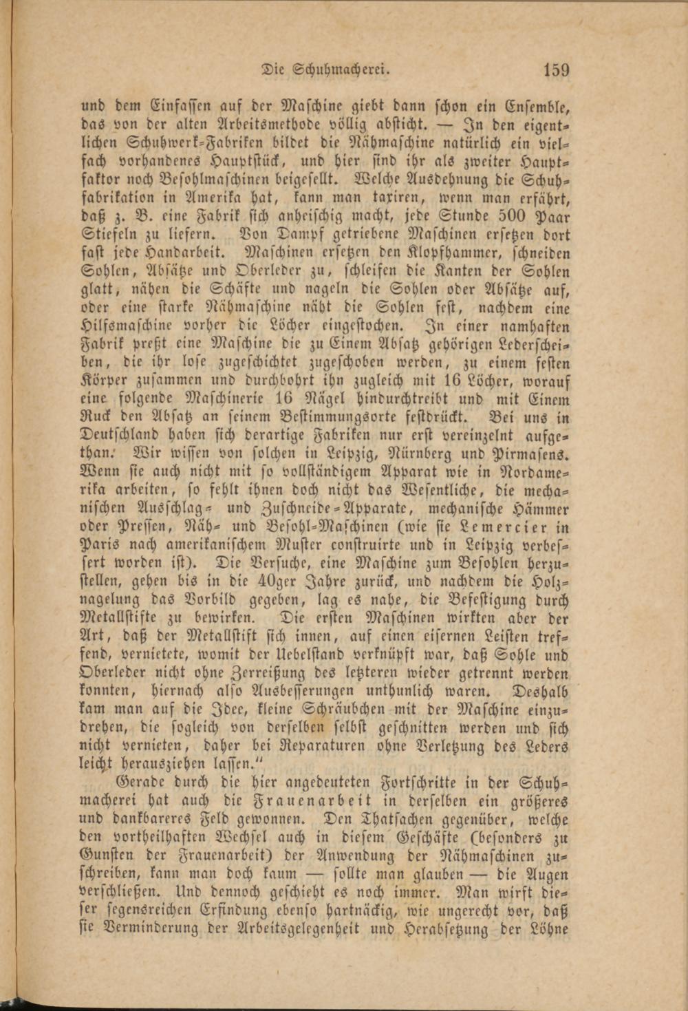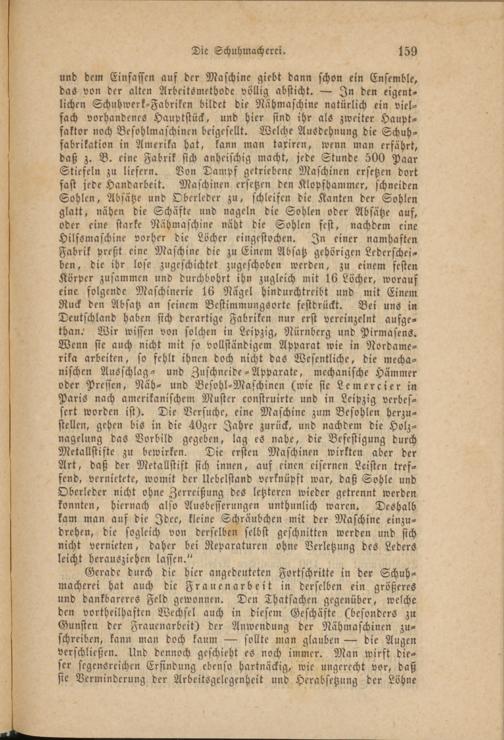 und dem Einfassen auf der Maschine giebt dann schon ein Ensemble, das von der alten Arbeitsmethode völlig absticht. — In den eigentlichen Schuhwerk-Fabriken bildet die Nähmaschine natürlich ein vielfach vorhandenes Hauptstück, und hier sind ihr als zweiter Hauptfaktor noch Besohlmaschincn beigesellt. Welche Ausdehnung die Schuhfabrikation in Amerika hat, kann man taxiren, wenn man erfährt, daß z. B. eine Fabrik sich anheischig macht, jede Stunde 500 Paar Stiefeln zu liefern. Von Dampf getriebene Maschinen ersetzen dort fast jede Handarbeit. Maschinen ersetzen den Klopfhammcr, schneiden Sohlen, Absätze und Oberleder zu, schleifen die Kanten der Sohlen glatt, nähen die Schäfte und nageln die Sohlen oder Absätze auf, oder eine starke Nähmaschine näht die Sohlen fest, nachdem eine HilsSmaschine vorher die Löcher eingestochen. In einer namhaften Fabrik preßt eine Maschine die zu Einem Absatz gehörigen Lederscheiben, die ihr lose zugescknchtct zugeschoben werden, zu einem festen Körper zusammen und durchbohrt ihn zugleich mit 16 Löcher, worauf eine folgende Maschinerie 16 Nagel hindurchtreibt und mit Einem Ruck den Absatz an seinem Bestimmungsorte festdrückt. Bei uns in Deutschland haben sich derartige Fabriken nur erst vereinzelnt aufge- than.' Wir wissen von solchen in Leipzig, Nürnberg und Pirmasens. Wenn sie auch nicht mit so vollständigem Apparat wie in Nordamerika arbeiten, so fehlt ihnen doch nicht das Wesentliche, die mechanischen Ausschlag- und Zuschneide-Apparate, mechanische Hammer oder Pressen, Näh- und Besohl-Maschinen (wie sie Lemercier in Paris nach amerikanischem Muster construirte und in Leipzig verbessert worden ist). Die Versuche, eine Maschine zum Besohlen herzustellen, gehen bis in die 40ger Jahre zurück, und nachdem die Holz- nagelung das Vorbild gegeben, lag es nahe, die Befestigung durch Mctallstifte zu bewirken. Die ersten Maschinen wirkten aber der Art, daß der Metallstift sich innen, auf einen eisernen Leisten treffend, vernietete, womit der Uebelstand verknüpft war, daß Sohle und Oberleder nicht ohne Zerreißung des letzteren wieder getrennt werden konnten, hiernach also Ausbesserungen unthunlich waren. Deshalb kam man auf die Idee, kleine Schräubchen mit der Maschine einzudrehen, die sogleich von derselben selbst geschnitten werden und sich nicht vernieten, daher bei Reparaturen ohne Verletzung des Leders leicht herausziehen lassen."