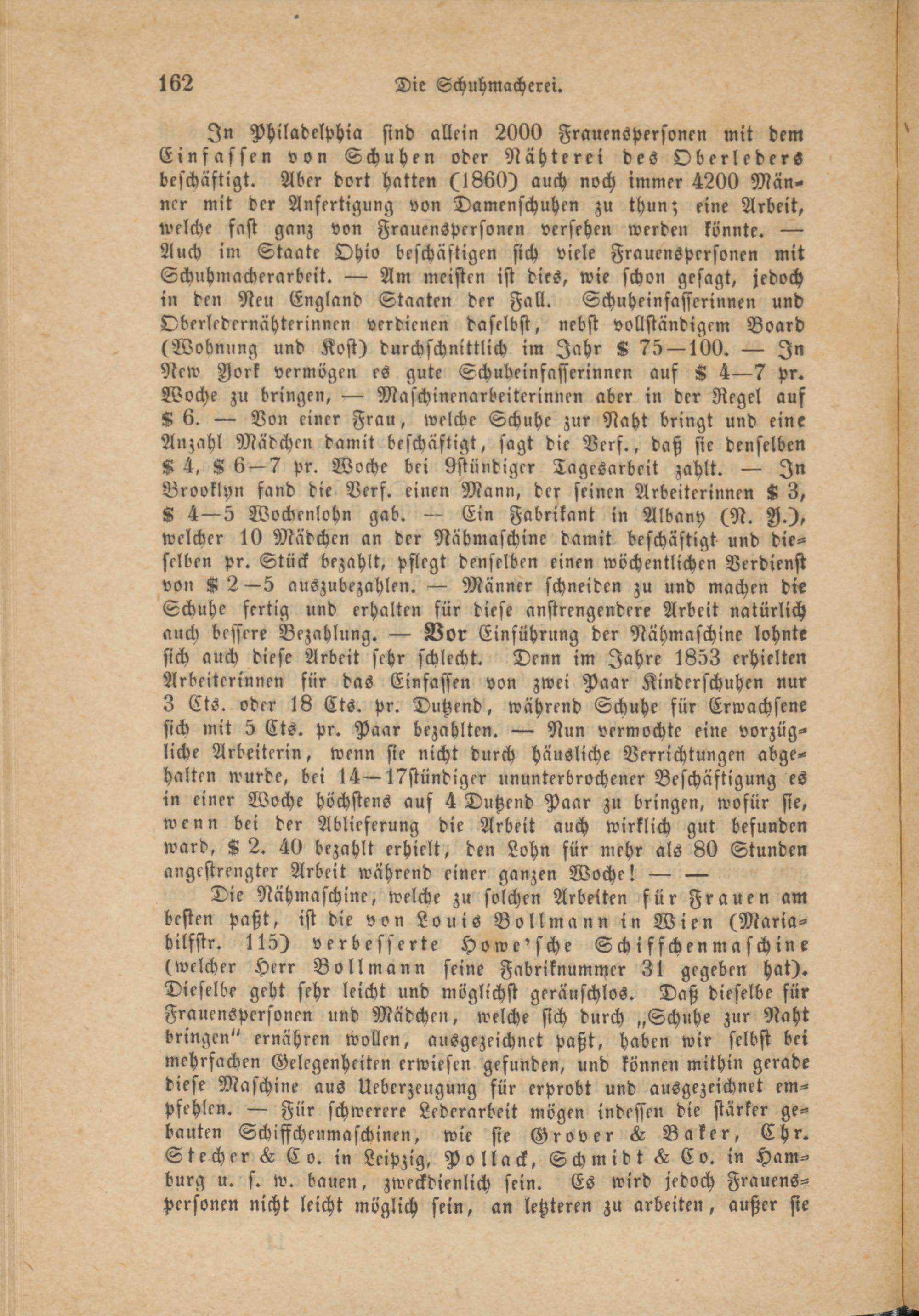In Philadelphia sind allein 2000 Frauenspersonen mit dem Einfassen von Schuhen oder Nähterei des Oberleders beschäftigt. Aber dort hatten (1860) auch noch immer 4200 Männer mit der Anfertigung von Damenschuhen zu thun; eine Arbeit, welche fast ganz von Frauenspersonen versehen werden könnte. — Auch im Staate Ohio beschäftigen sich viele Frauenspersonen mit Schuhmacherarbeit. — Am meisten ist dies, wie schon gesagt, jedoch in den Neu England Staaten der Fall. Schuheinfafscrinnen und Oberlrdcrnähterinnrn verdienen daselbst, nebst vollständigem Board (Wobnung und Kost) durchschnittlich im Jahr L 75 —100. — In New Jork vermögen es gute Schubeinfasserinnen auf K 4—7 pr. Woche zu bringen, — Maschinenarbeitcrinnen aber in der Regel auf L 6. — Von einer Frau, welche Schuhe zur Naht bringt und eine Anzahl Mädchen damit beschäftigt, sagt die Verf., daß sie denselben K 4, S 6 — 7 pr. Woche bei Ostündigrr Tagesarbeit zahlt. — In Brooklyn fand die Verf. einen Mann, der seinen Arbeiterinnen K 3, L 4—5 Wockenlohn gab. — Ein Fabrikant in Albany (N. I), welcher 10 Mädchen an der Nähmaschine damit beschäftigt und dieselben pr. Stück bezahlt, pflegt denselben einen wöchentlichen Verdienst von H 2—5 auszubezahlen. — Männer schneiden zu und machen die Schuhe fertig und erhalten für diese anstrengendere Arbeit natürlich auch bessere Bezahlung. — Vor Einführung der Nähmaschine lohnte sich auch diese Arbeit sehr schleckt. Denn im Jahre 1853 erhielten Arbeiterinnen für das Einfassen von zwei Paar Kinderschuhen nur 3 Cts. oder 18 Cts. pr. Dutzend, während Schuhe für Erwachsene sich mit 5 Cts. pr. Paar bezahlten. — Nun vermochte eine vorzügliche Arbeiterin, wenn sie nicht durch häusliche Verrichtungen abgehalten wurde, bei 14—17stündiger ununterbrochener Beschäftigung es in einer Woche höchstens auf 4 Dutzend Paar zu bringen, wofür sie, wenn bei der Ablieferung die Arbeit auch wirklich gut befunden ward, K 2. 40 bezahlt erhielt, den Lohn für mehr als 80 Stunden angestrengter Arbeit während einer ganzen Woche! — —