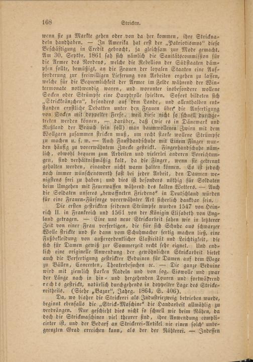 Da, wo bisher die Strickerei als Industriezweig betrieben wurde, beginnt ebenfalls die „Strick-Maschine" die Handarbeit allmählig zu verdrängen. Nur geschieht dies nicht so schnell wie beim Nähen, da doch die Strickmaschinen viel theurer sind, ihre Anwendung compli- cirter ist, und der Bedarf an Strickerei-Artikel nie einen solch' unbegrenzten Grad erreichen kann, als der der Nähterei. — Indessen