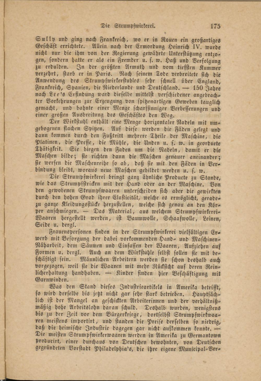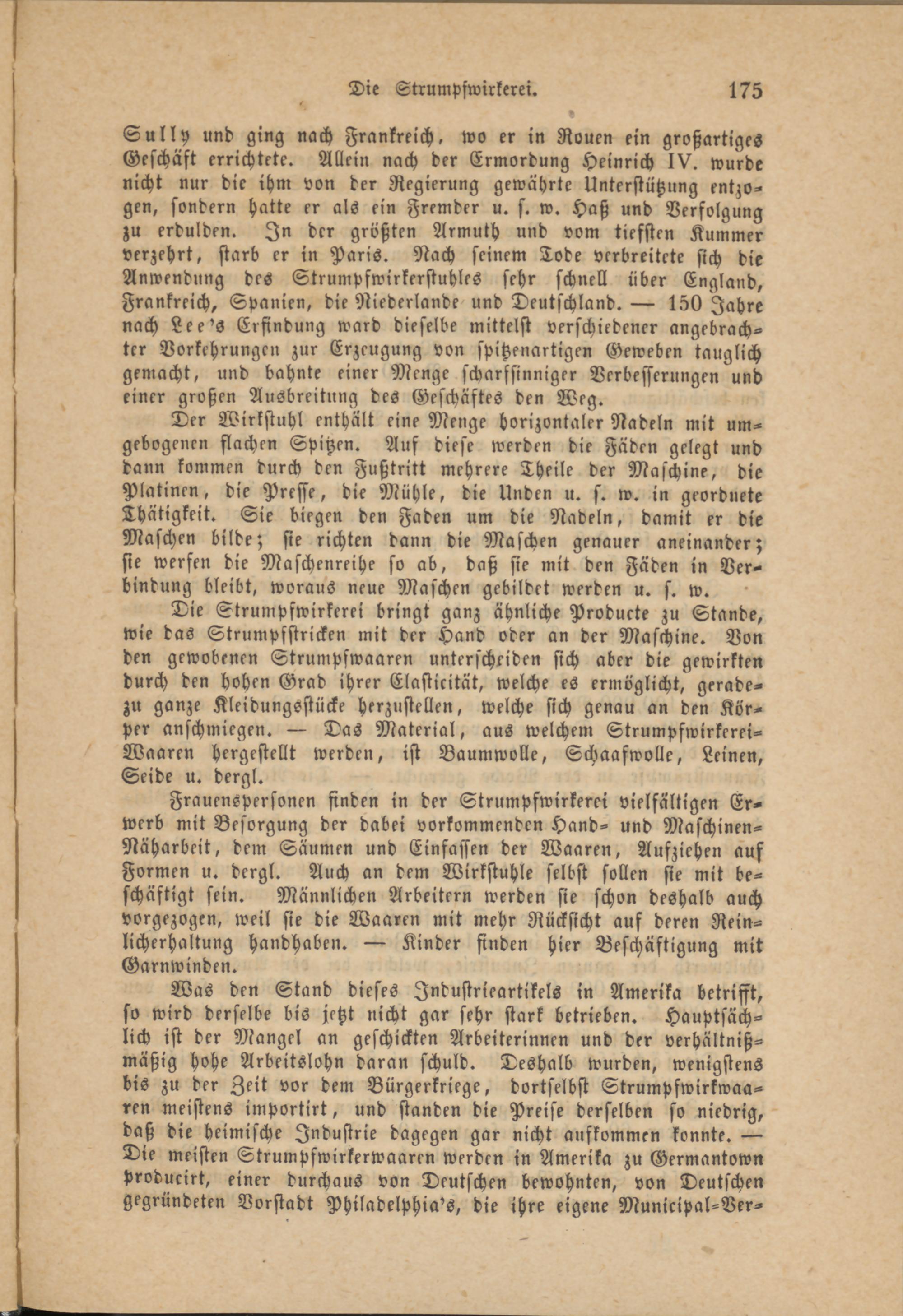 Sully und ging nach Frankreich, wo er in Rouen ein großartiges Geschäft errichtete. Allein nach der Ermordung Heinrich IV. wurde nicht nur die ihm von der Regierung gewährte Unterstützung entzogen, sondern hatte er als ein Fremder u. s. w. Haß und Verfolgung zu erdulden. Zn der größten Armuth und vom tiefsten Kummer verzehrt, starb er in Paris. Nach seinem Tode verbreitete sich die Anwendung des Strumpfwirkerstuhlrs sehr schnell über England, Frankreich, Spanien, die Niederlande und Deutschland. — 150 Jahre nach Lee's Erfindung ward dieselbe mittelst verschiedener angebrachter Vorkehrungen zur Erzeugung von spitzenartigen Geweben tauglich gemacht, und bahnte einer Menge scharfsinniger Verbesserungen und einer großen Ausbreitung des Geschäftes den Weg.