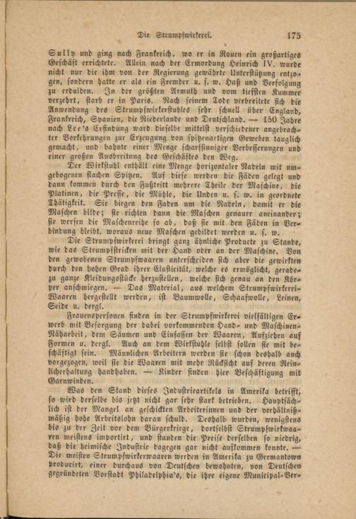 Was den Stand dieses Jndustrieartikels in Amerika betrifft, so wird derselbe bis jetzt nicht gar sehr stark betrieben. Hauptsächlich ist der Mangel an geschickten Arbeiterinnen und der verhältniß- mäßig hohe Arbeitslohn daran schuld. Deshalb wurden, wenigstens bis zu der Zeit vor dem Bürgerkriege, dortselbst Strumpfwirkwaa- ren meistens importirt, und standen die Preise derselben so niedrig, daß die beimische Industrie dagegen gar nicht auskommen konnte. — Die meisten Strumpfwirkerwaaren werden in Amerika zu Germantown Producirt, einer durchaus von Deutschen bewohnten, von Deutschen gegründeten Vorstadt Philadelphia's, die ihre eigene Municipal-Ver-