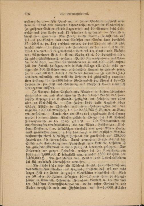 In Europa stehen England und Sachsen in diesem Industriezweige oben an, und übertreffen die Produkte dieser Länder das französische Erzeugniß an Elasticität, Festigkeit und Feinheit, vor allem aber an Wohlfeilheit. — Im Jahre 1844 hatte England schon 48,482 Stühle in Thätigkeit mit einem Bedienungspersonal von ungefähr 100,000 Menschen, die für 2,562,763 A Werthes an Waaren herstellten. — Durch eine von Brunel angebrachte Verbesserung wurde die von Einem Stuhle gelieferte Menge auf 150 Dutzend Frauenstrümpfe in der Woche gebracht. — Die Nebenarbeiten bei der Strumpfwaarenfabrikation, als das Nähen, Zuschneiden, Bleichen, Pressen u. s. w. beschäftigen ebenfalls eine große Menge Hände, meist Frauenspersonen, so daß das ganze in der englischen Maschi- nenstrumpfwirkerei beschäftigte Personal für gewöhnlich auf 120,000 Individuen sich herausstellt. Durch vermehrte Geschwindigkeit der Stühle und Anwendung von Dampfkraft zum Betriebe derselben ist das gelieferte Material in der letzten Zeit bedeutend gestiegen. Der Geldwerth der ganzen Industrie, welcher bei der Ausstellung von 1851 auf 3,600,000 L festgestellt war, erreichte 1860 die Höhe von 6,480,000 A. Die Fabrikation von Hemden und Unterbeinkleidern hat sich wahrhaft überraschend vermehrt.