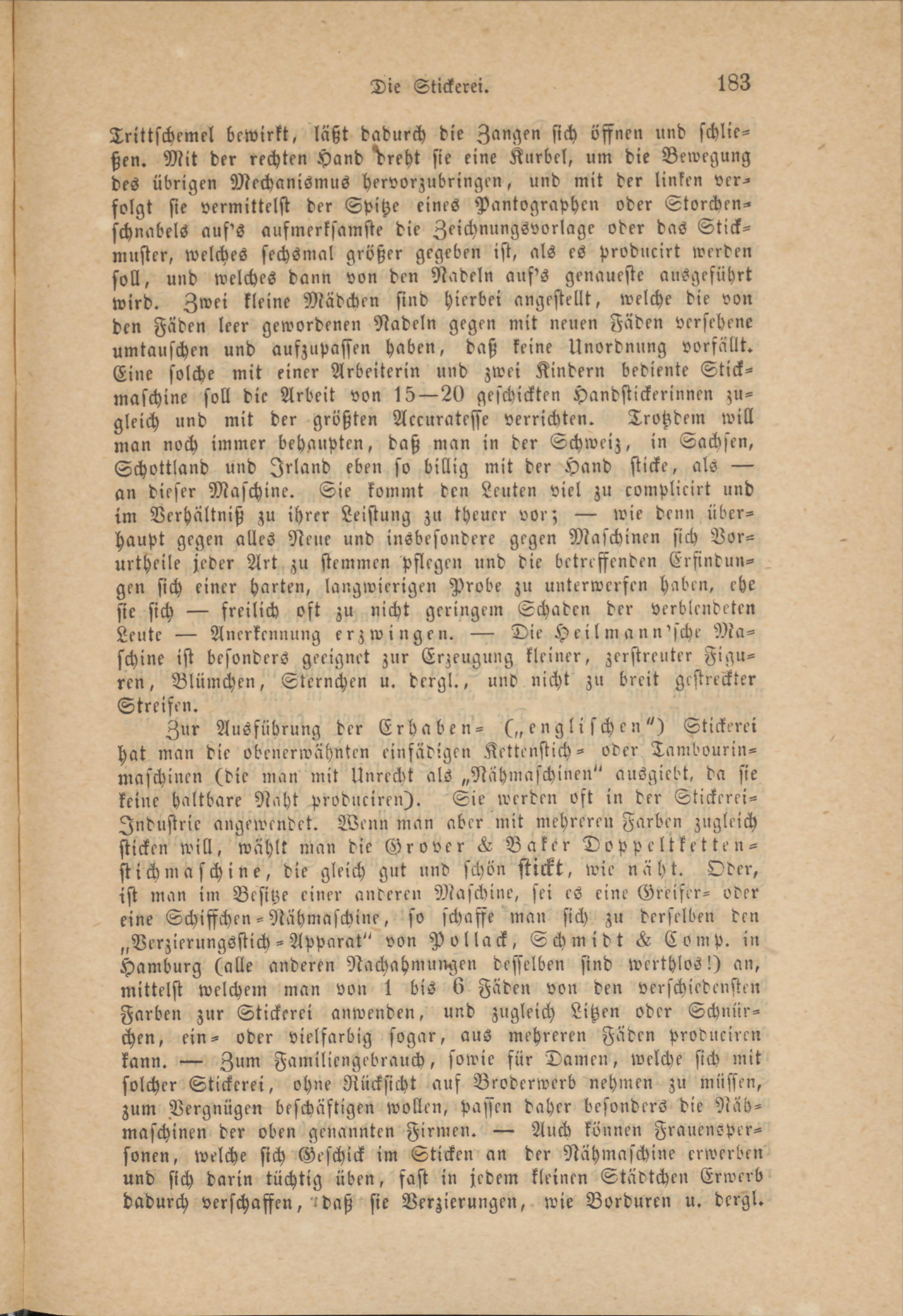 Zur Ausführung der Erhaben- („englischen") Stickerei hat man die obenerwähnten einfädigen Kettenstich- oder Tambourin- maschincn (die man mit Unrecht als „Nähmaschinen" auSgiebt, da sie keine haltbare Naht produciren). Sie werden oft in der Stickerei- Industrie angewendet. Wenn man aber mit mehreren Farben zugleich sticken will» wählt man die Grover L Baker Doppeltketten- stichmaschine, die gleich gut und schön stickt, wie näht. Oder, ist man im Besitze einer unteren Maschine, sei es eine Greifer- oder eine Schiffchen-Nähmaschine, so schaffe man sich zu derselben den „Verzierungsstich - Apparat" von Pollack, Schmidt L Comp. in Hamburg (alle anderen Nachahmungen desselben sind werthlos!) an, mittelst welchem man von 1 bis 6 Fäden von den verschiedensten Farben zur Stickerei anwenden, und zugleich Litzen oder Schnürchen, ein- oder vielfarbig sogar, aus mehreren Fäden produciren kann. — Zum Familiengebrauch, sowie für Damen, welche sich mit solcher Stickerei, ohne Rücksicht auf Broderwerb nehmen zu müssen, zum Vergnügen beschäftigen wollen, passen daher besonders die Nähmaschinen der oben genannten Firmen. — Auch können Frauenspersonen, welche sich Geschick im Sticken an der Nähmaschine erwerben und sich darin tüchtig üben, fast in jedem kleinen Städtchen Erwerb dadurch verschaffen, 'idaß sie Verzierungen, wie Bordüren u. dergl.