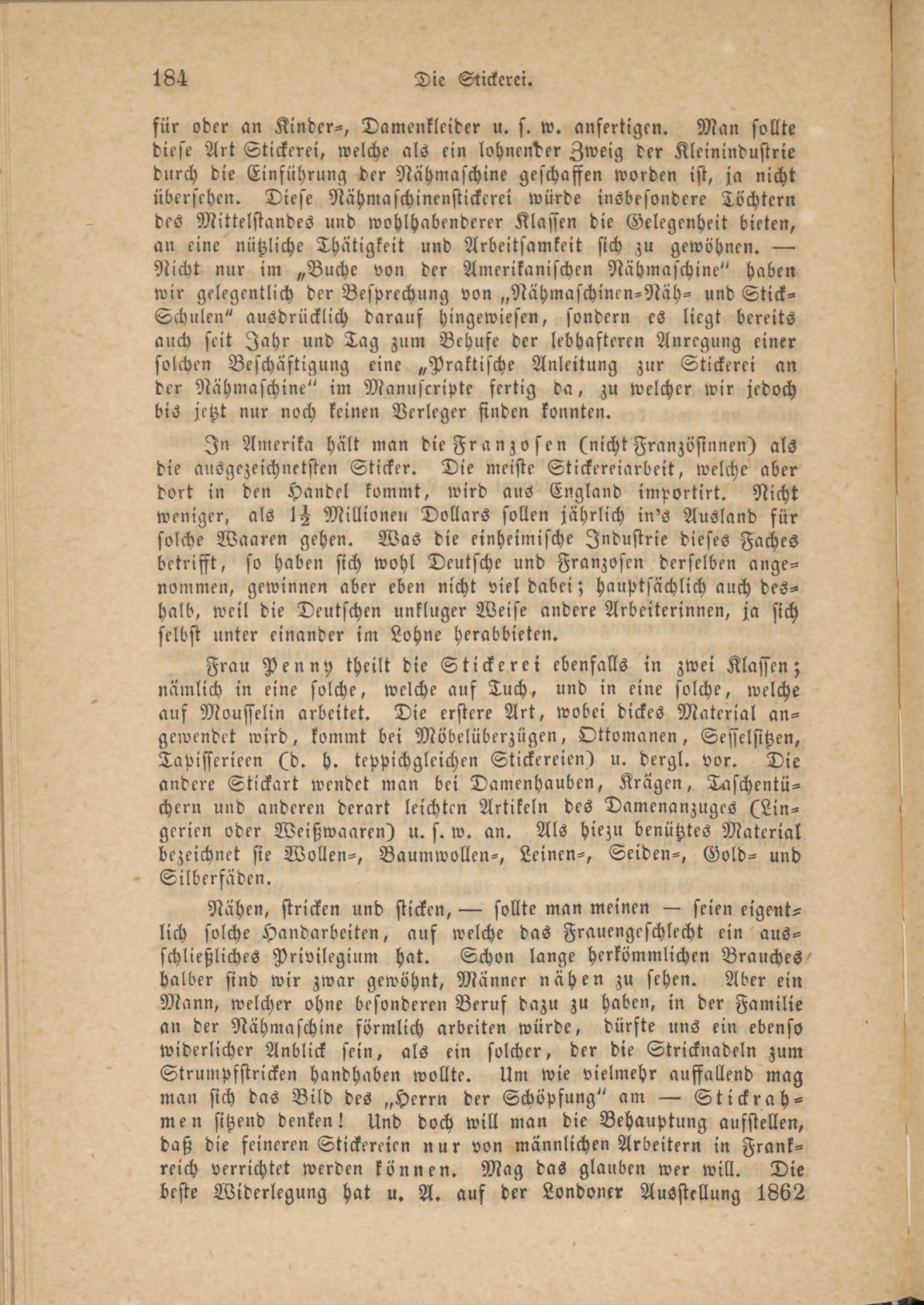 In Amerika hält man die Franzosen (nicht Französinnen) als die ausgezeichnetsten Sticker. Die meiste Stickereiarbeit, welche aber dort in den Handel kommt, wird aus England importirt. Nicht weniger, als 1H Millionen Dollars sollen jährlich in's Ausland für solche Waaren gehen. Was die einheimische Industrie dieses Faches betrifft, so haben sich wohl Deutsche und Franzosen derselben angenommen, gewinnen aber eben nicht viel dabei; hauptsächlich auch deshalb, weil die Deutschen unkluger Weise andere Arbeiterinnen, ja sich selbst unter einander im Lohne Herabbieten.