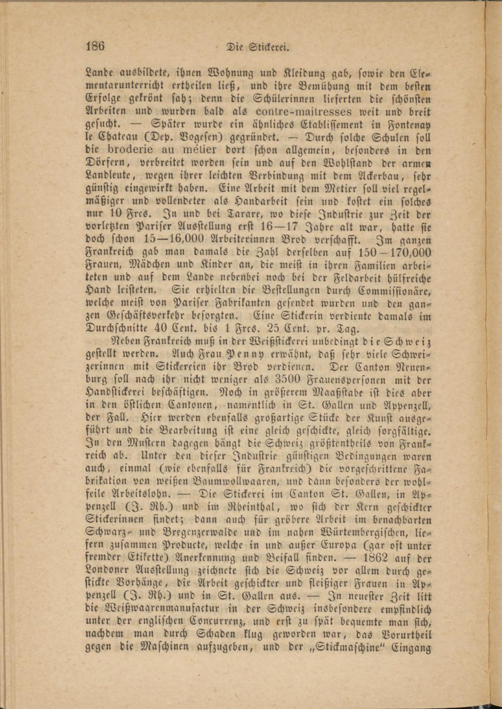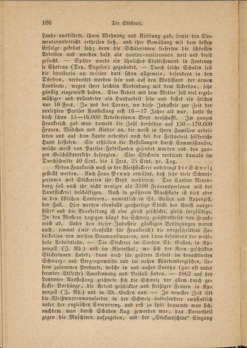 Neben Frankreich muß in der Weißstickcrei unbedingt dieSchweiz gestellt werden. Auch Frau Penny erwähnt, daß sehr viele Schweizerinnen mit Stickereien ihr Brod verdienen. Der Canton Neuenburg soll nach ihr nicht weniger als 3500 Frauenspersonen mit der Handstickerei beschäftigen. Noch in größerem Maaßstabe ist dies aber in den östlichen Cantonen, namentlich in St. Gallen und Appenzell, der Fall. Hier werden ebenfalls großartige Stücke der Kunst ausgeführt und die Bearbeitung ist eine gleich geschickte, gleich sorgfältige. In den Mustern dagegen hängt die Schweiz größtentheils von Frankreich ab. Unter den dieser Industrie günstigen Bedingungen waren auch, einmal (wie ebenfalls für Frankreich) die vorgeschrittene Fabrikation von weißen Baumwollwaaren, und dann besonders der wohlfeile Arbeitslohn. — Die Stickerei im Canton St. Gallen, in Appenzell (I. Rh.) und im Rheinthal, wo sich der Kern geschickter Stickerinnen findet; dann auch für gröbere Arbeit im benachbarten Schwarz- und Bregenzerwalde und im nahen Würtembergischen, liefern zusammen Producte, welche in und außer Europa (gar oft unter fremder Etikette) Anerkennung und Beifall finden. — 1862 auf der Londoner Ausstellung zeichnete sich die Schweiz vor allem durch gestickte Vorhänge, die Arbeit geschickter und fleißiger Frauen in Appenzell (I. Rh.) und in St. Gallen aus. — In neuester Zeit litt die Weißwaarenmanufactur in der Schweiz insbesondere empfindlich unter der englischen Concurrenz, und erst zu spät bequemte man sich, nachdem man durch Schaden klug geworden war, das Vorurtheil gegen die Maschinen aufzugeben, und der „Stickmaschine" Eingang