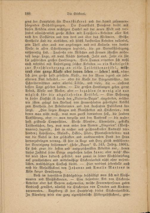 Auch im bayrischen Fichtelgebirge beschäftigt man sich mit Weißwaaren und Weißstickercien. — Eine besondere Art von Stickerei- Arbeiten aber hat Bayern auszuweisen, welche Frauenspersonen guten Verdienst gewährt, nämlich die Stickereien von Ornaten und Kirchen- paramenten. Augsburg ist der Hauptplatz dieses Stickereiartikels. In Nürnberg wird eine ganz eigenthümliche Flittergoldstickerei, gro-