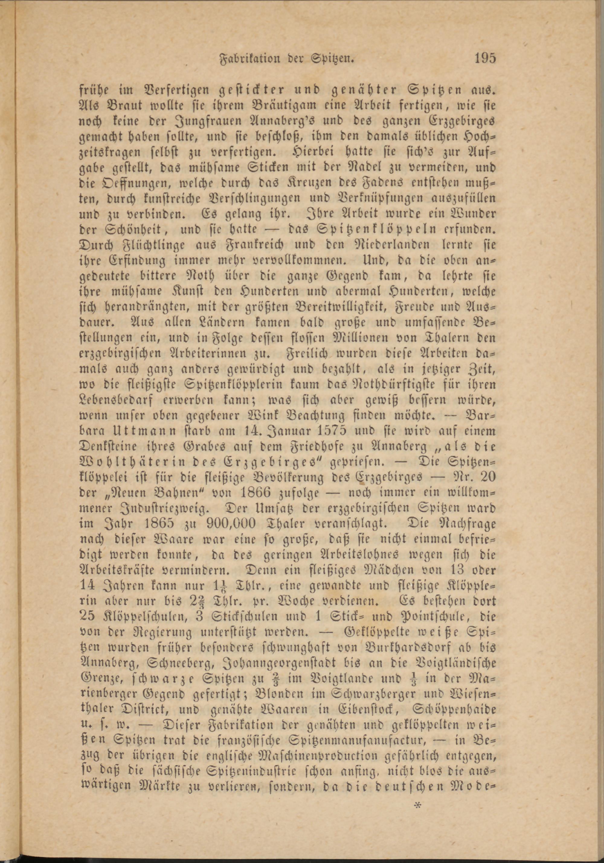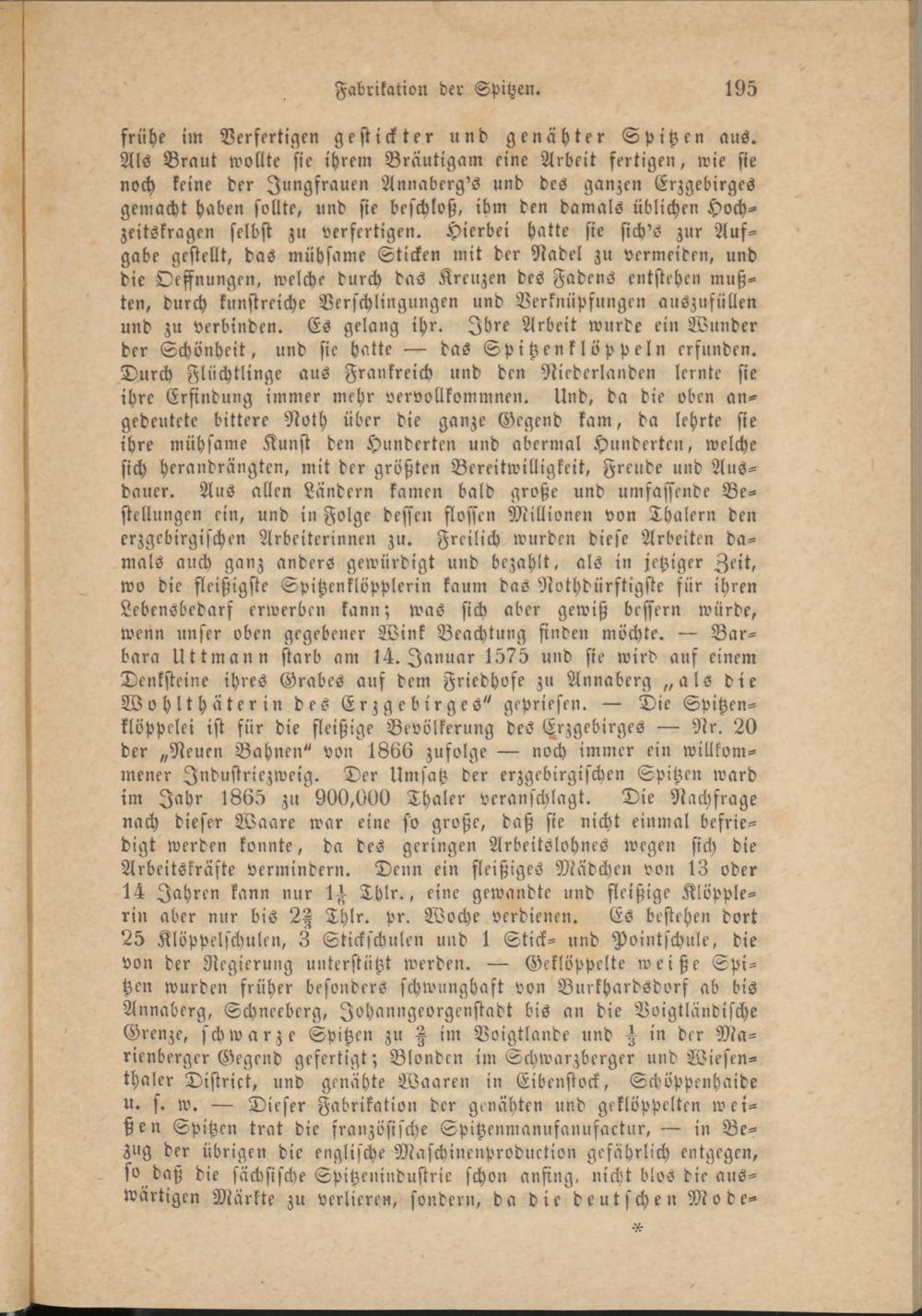 frühe im Verfertigen gestickter und genähter Spitzen aus. Als Braut wollte sie ihrem Bräutigam eine Arbeit fertigen, wie sie noch keine der Jungfrauen Annaberg's und des ganzen Erzgebirges gemacht haben sollte, und sie beschloß, ihm den damals üblichen Hochzeitstagen selbst zu verfertigen. Hierbei hatte sie sich'S zur Aufgabe gestellt, das mühsame Sticken mit der Nadel zu vermeiden, und die Oessnungen, welche durch das Kreuzen des Fadens entstehen mußten, durch kunstreiche Verschlingungen und Verknüpfungen auszufüllen und zu verbinden. Es gelang ihr. Ihre Arbeit wurde ein Wunder der Schönheit, und sie hatte — das Spitzenklöppeln erfunden. Durch Flüchtlinge aus Frankreich und den Niederlanden lernte sie ihre Erfindung immer mehr vervollkommnen. Und, da die oben angedeutete bittere Noth über die ganze Gegend kam, da lehrte sie ihre mühsame Kunst den Hunderten und übermal Hunderten, welche sich herandrängten, mit der größten Bereitwilligkeit, Freude und Ausdauer. Aus allen Ländern kamen bald große und umfassende Bestellungen ein, und in Folge dessen flössen Millionen von Thalern den erzgebirgischen Arbeiterinnen zu. Freilich wurden diese Arbeiten damals auch ganz anders gewürdigt und bezahlt, als in jetziger Zeit, wo die fleißigste Spitzenklöpplerin kaum das Nothdürftigste für ihren Lebensbedarf erwerben kann; was sich aber gewiß bessern würde, wenn unser oben gegebener Wink Beachtung finden möchte. — Barbara Uttmann starb am 14. Januar 1575 und sie wird auf einem Denksteine ihres Grabes auf dem Friedhofe zu Annaberg „als die Wohlthäterin des Erzgebirges" gepriesen. — Die Spitzen- klöppelei ist für die fleißige Bevölkerung des (Erzgebirges — Nr. 20 der „Neuen Bahnen" von 1866 zufolge — noch immer ein willkommener Industriezweig. Der Umsatz der erzgebirgischen Spitzen ward im Jahr 1865 zu 900,000 Thaler veranschlagt. Die Nachfrage nach dieser Waare war eine so große, daß sie nicht einmal befriedigt werden konnte, da des geringen Arbeitslohnes wegen sich die Arbeitskräfte vermindern. Denn ein fleißiges Mädchen von 13 oder 14 Jahren kann nur 1^ Thlr., eine gewandte und fleißige Klöpplerin aber nur bis 2H Thlr. pr. Woche verdienen. Es bestehen dort 25 Klöppelschulen, 3 Stickschulen und 1 Stick- und Pointschule, die von der Regierung unterstützt werden. — Geklöppelte weiße Spitzen wurden früher besonders schwunghaft von BurkhardSdors ab bis Annaberg, Schneebcrg, Johanngeorgenstadt bis an die Voigtlandische Grenze, schwarze Spitzen zu A im Voigtlande und in der Ma- rienberger Gegend gefertigt; Blonden im Schwarzberger und Wiesen- thaler Distrikt, und genähte Waaren in Eibenstock, Schöppenhaide u. s. w. — Dieser Fabrikation der genähten und geklöppelten weißen Spitzen trat die französische Spitzenmanufanufactur, — in Bezug der übrigen die englische Maschinenproduction gefährlich entgegen, so daß die sächsische Spitzenindustrie schon anfing, nicht blos die auswärtigen Märkte zu verlieren, sondern, da die deutschen Mode-