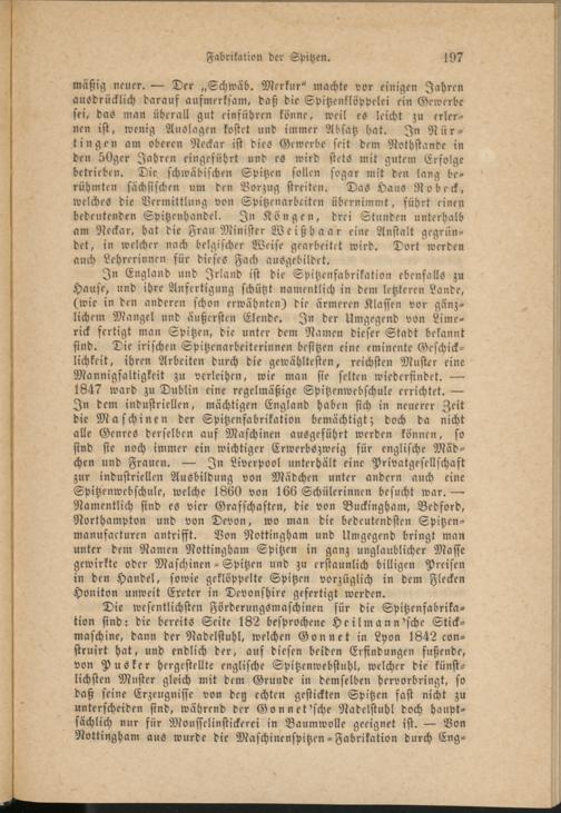 Die wesentlichsten Förderungsmaschinen für die Spitzenfabrikation sind: die bereits Seite 182 besprochene He ilm an nasche Stick- maschine, dann der Nadelstuhl, welchen Gönnet in Lyon 1842 con- struirt hat, und endlich der, auf diesen beiden Erfindungen fußende, von Pusker hergestellte englische Spitzenwebstuhl, welcher die künstlichsten Muster gleich mit dem Grunde in demselben hervorbringt, so daß seine Erzeugnisse von derz echten gestickten Spitzen fast nicht zu unterscheiden sind, während der Gonnet'sche Nadclstuhl doch hauptsächlich nur für Moufselinstickerei in Baumwolle geeignet ist. — Von Nottingham aus wurde die Maschinensätzen - Fabrikation durch Eng-