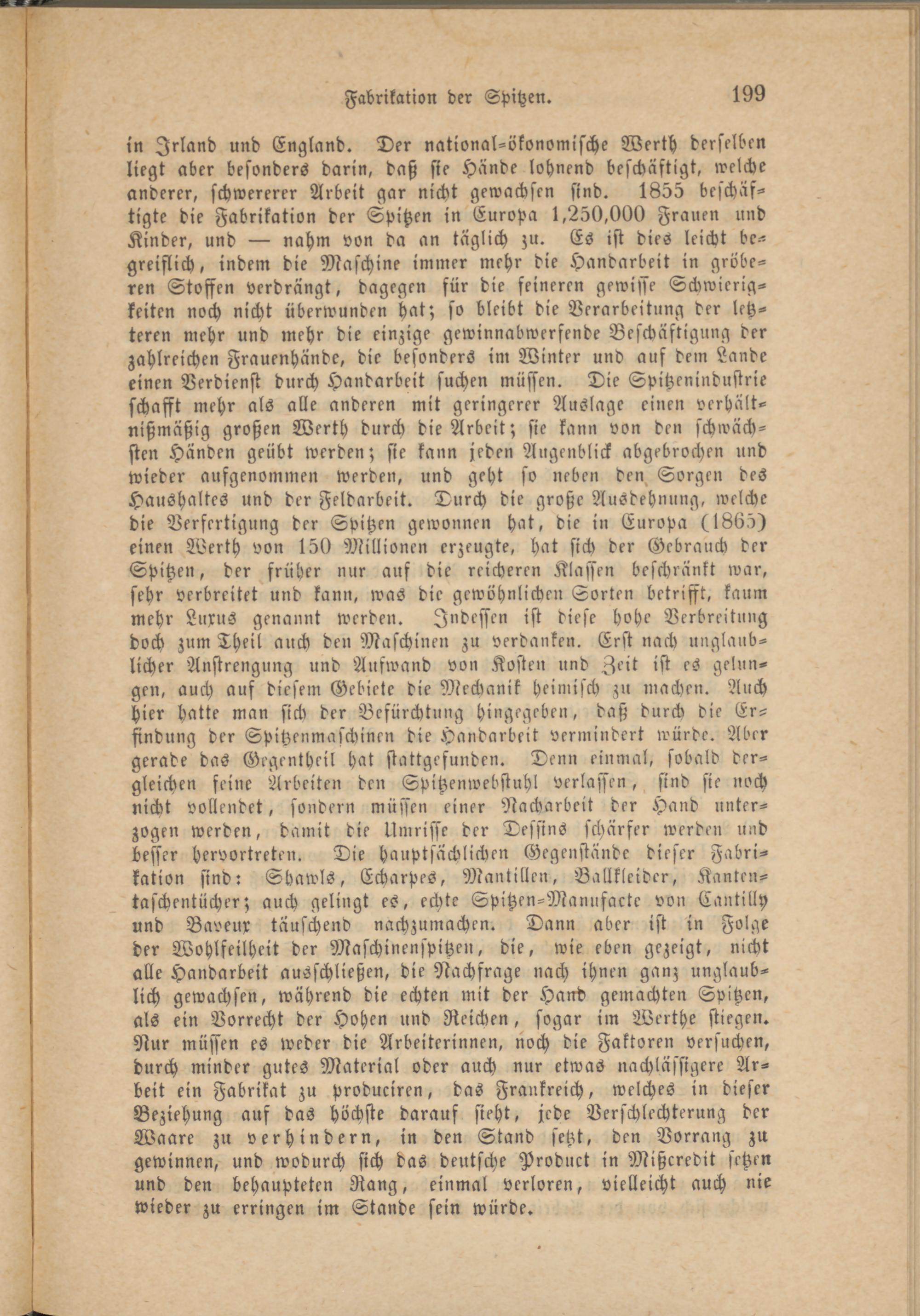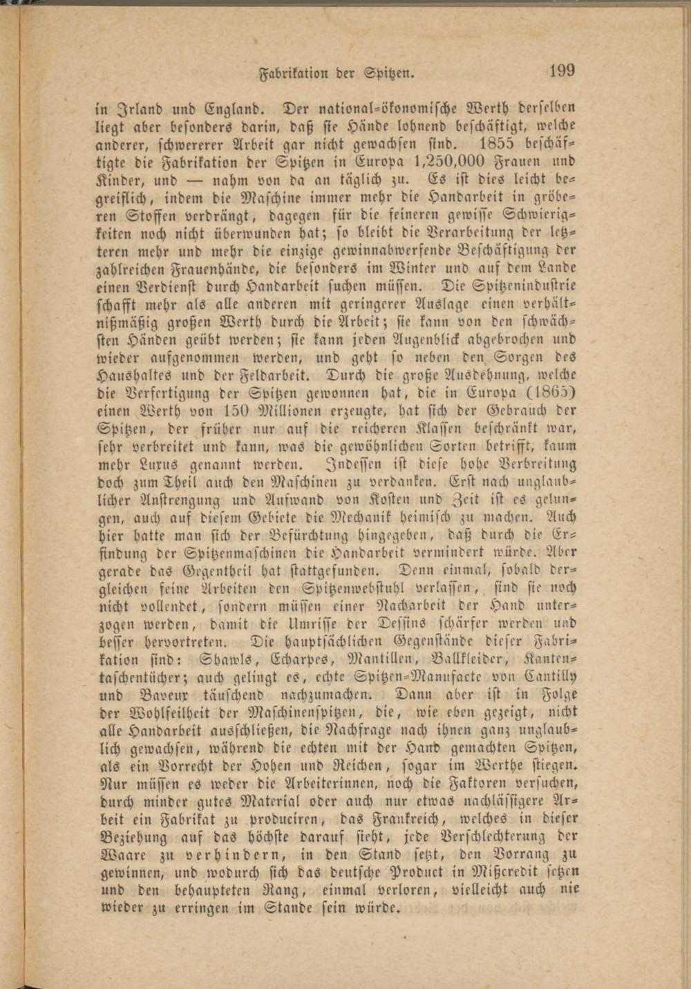 in Irland und England. Der national-ökonomische Werth derselben liegt aber besonders darin, daß sie Hände lohnend beschäftigt, welche anderer, schwererer Arbeit gar nicht gewachsen sind. 1855 beschäftigte die Fabrikation der Spitzen in Europa 1,250,000 Frauen und Kinder, und — nahm von da an täglich zu. Es ist dies leicht begreiflich, indem die Maschine immer mehr die Handarbeit in gröberen Stoffen verdrängt, dagegen für die feineren gewisse Schwierigkeiten noch nicht überwunden hat; so bleibt die Verarbeitung der letzteren mehr und mehr die einzige gewinnabwerfende Beschäftigung der zahlreichen Frauenhände, die besonders im Winter und auf dem Lande einen Verdienst durch Handarbeit suchen müssen. Die Spitzenindustrie schafft mehr als alle anderen mit geringerer Auslage einen verhält- nißmäßig großen Werth durch die Arbeit; sie kann von den schwächsten Händen geübt werden; sie kaun jeden Augenblick abgebrochen und wieder aufgenommen werden, und geht so neben den. Sorgen des Haushaltes und der Feldarbeit. Durch die große Ausdehnung, welche die Verfertigung der Spitzen gewonnen hat, die in Europa (1865) einen Werth von 150 Millionen erzeugte, hat sich der Gebrauch der Spitzen, der früher nur auf die reicheren Klassen beschränkt war, sehr verbreitet und kann, was die gewöhnlichen Sorten betrifft, kaum mehr Luxus genannt werden. Indessen ist diese hohe Verbreitung doch zum Theil auch den Maschinen zu verdanken. Erst nach unglaublicher Anstrengung und Aufwand von Kosten und Zeit ist es gelungen, auch auf diesem Gebiete die Mechanik heimisch zu machen. Auch hier hatte man sich der Befürchtung hingegeben, daß durch die Erfindung der Spitzenmaschinen die Handarbeit vermindert würde. Aber gerade das Gegentheil hat stattgefunden. Denn einmal, sobald dergleichen feine Arbeiten den Spitzenwebstuhl verlassen, sind sie noch nicht vollendet, sondern müssen einer Nacharbeit der Hand unterzogen werden, damit die Umrisse der Dessins schärfer werden und besser hervortreten. Die hauptsächlichen Gegenstände dieser Fabrikation sind: Shawls, Eebarpes, Mantilleu, Ballkleider, Kanten- taschentücher; auch gelingt es, echte Spitzen-Manufacte von Cantilly und Baveux täuschend nachzumachen. Dann aber ist in Folge der Wohlfeilheit der Maschinensätzen, die, wie eben gezeigt, nicht alle Handarbeit ausschließen, die Nachfrage nach ihnen ganz unglaublich gewachsen, während die echten mit der Hand gemachten Spitzen, als ein Vorrecht der Hohen und Reichen, sogar im Werthe stiegen. Nur müssen es weder die Arbeiterinnen, noch die Faktoren versuchen, durch minder gutes Material oder auch nur etwas nachlässigere Arbeit ein Fabrikat zu produciren, das Frankreich, welches in dieser Beziehung auf das höchste darauf sieht, jede Verschlechterung der Waare zn verhindern, in den Stand setzt, den Vorrang zu gewinnen, und wodurch sich das deutsche Product in Mißcredit setzen und den behaupteten Rang, einmal verloren, vielleicht auch nie wieder zu erringen im Stande sein würde.