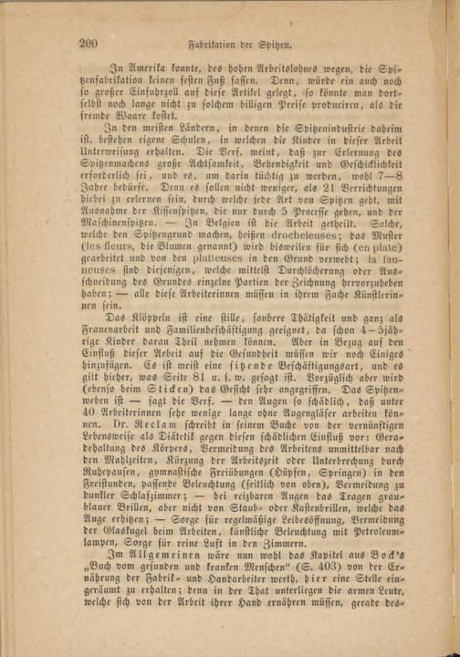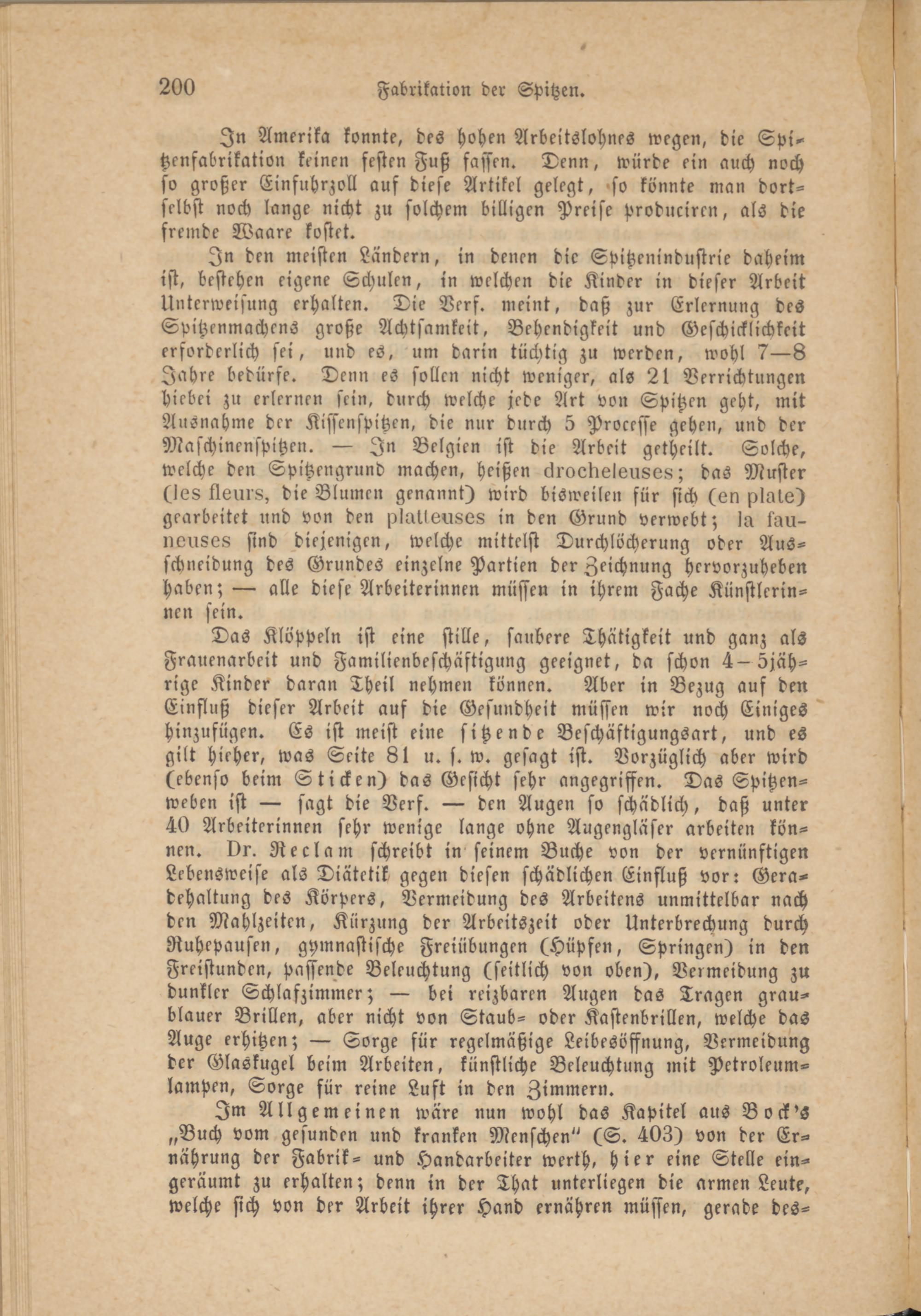 Das Klöppeln ist eine stille, saubere Thätigkeit und ganz als Frauenarbeit und Familienbeschäftigung geeignet, da schon 4 —5jäh- rige Kinder daran Theil nehmen können. Aber in Bezug auf den Einfluß dieser Arbeit auf die Gesundheit müssen wir noch Einiges hinzufügen. Es ist meist eine sitzende Beschäftigungsart, und es gilt hirher, was Seite 81 u. s. w. gesagt ist. Vorzüglich aber wird (ebenso beim Sticken) das Gesicht sehr angegriffen. Das Spitzen- weben ist — sagt die Verf. — den Augen so schädlich, daß unter 40 Arbeiterinnen sehr wenige lange ohne Augengläser arbeiten können. Dr. Reclam schreibt in seinem Buche von der vernünftigen Lebensweise als Diätetik gegen diesen schädlichen Einfluß vor: Geradehaltung des Körpers, Vermeidung des Arbeitcns unmittelbar nach den Mahlzeiten, Kürzung der Arbeitszeit oder Unterbrechung durch Ruhepausen, gymnastische Freiübungen (Hüpfen, Springen) in den Freistunden, passende Beleuchtung (seitlich von oben), Vermeidung zu dunkler Schlafzimmer; — bei reizbaren Augen das Tragen graublauer Brillen, aber nicht von Staub- oder Kastenbrillen, welche das Auge erhitzen; — Sorge für regelmäßige Leibesöffnung, Vermeidung der Glaskugel beim Arbeiten, künstliche Beleuchtung mit Petroleumlampen, Sorge für reine Luft in den Zimmern.