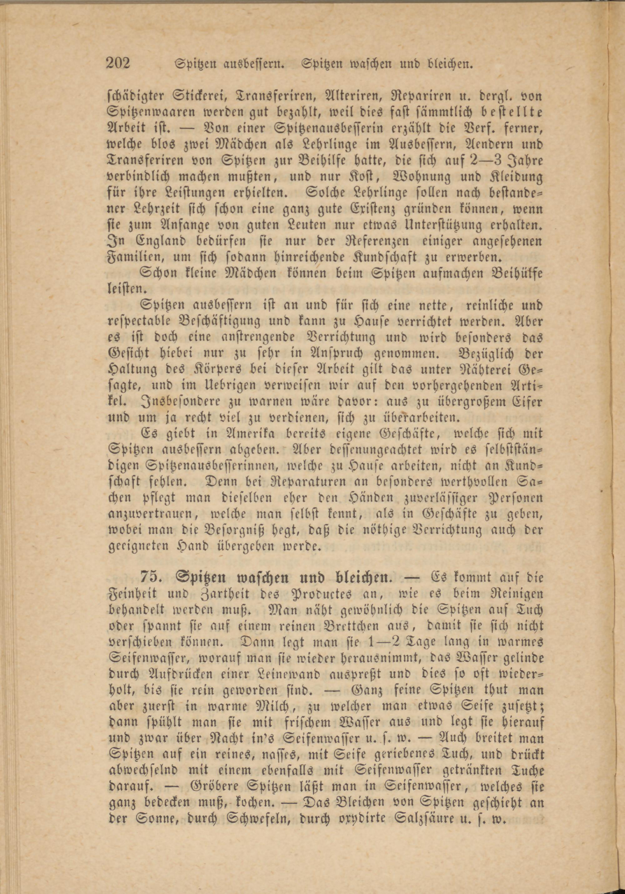 schädigter Stickerei, Transferiren, Alteriren, Nepariren u. dcrgl. von Spitzenwaarcn werden gut bezahlt, weil dies fast sämmtlich bestellte Arbeit ist. — Von einer Spitzenausbesserin erzählt die Verf. ferner, welche blos zwei Mädchen als Lehrlinge im Ausbessern, Aendern und Transferiren von Spitzen zur Beihilfe hatte, die sich auf 2—3 Jahre verbindlich machen mußten, und nur Kost, Wohnung und Kleidung für ihre Leistungen erhielten. Solche Lehrlinge sollen nach bestandener Lehrzeit sich schon eine ganz gute Existenz gründen können, wenn sie zum Anfange von guten Leuten nur etwas Unterstützung erhalten. In England bedürfen sie nur der Referenzen einiger angesehenen Familien, um sich sodann hinreichende Kundschaft zu erwerben.