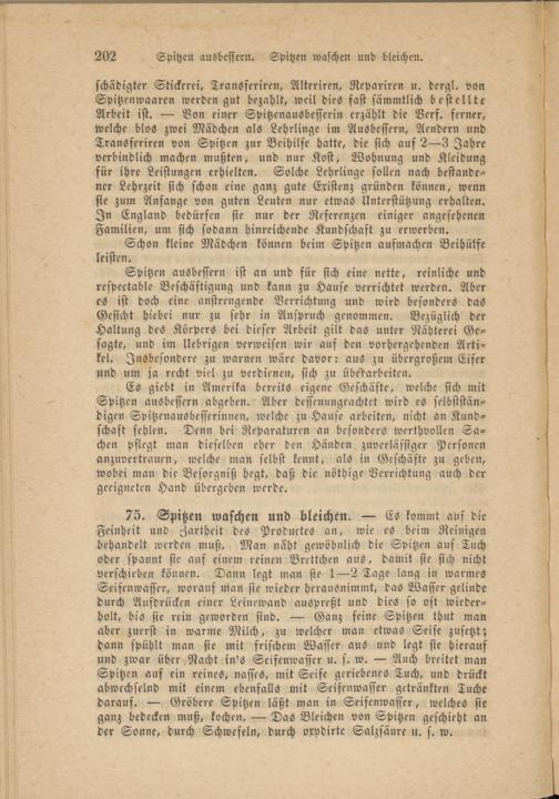 75. Spitzen waschen und bleichen. — Es kommt auf die Feinheit und Zartheit des Productes an, wie es beim Reinigen behandelt werden muß. Man näht gewöhnlich die Spitzen aus Tuch oder spannt sie auf einem reinen Brettchen aus, damit sie sich nicht verschieben können. Dann legt man sie 1—2 Tage lang in warmes Seifenwasser, worauf Man sie wieder herausnimmt, das Wasser gelinde durch Aufdrücken einer Leinewand auspreßt und dies so oft wiederholt, bis sie rein geworden sind. — Ganz feine Spitzen thut man aber zuerst in warme Milch, zu welcher man etwas Seife zusetzt; dann spühlt man sie mit frischem Wasser aus und legt sie hierauf und zwar über Nacht in's Seifenwasser u. s. w. — Auch breitet man Spitzen auf ein reines, nasses, mit Seife geriebenes Tuch, und drückt abwechselnd mit einem ebenfalls mit Seifenwasser getränkten Tuche darauf. — Gröbere Spitzen läßt man in Seifenwasser, welches sie ganz bedecken muß, kochen. — Das Bleichen von Spitzen geschieht an der Sonne, durch Schwefeln, durch oxydirte Salzsäure u. s. w.