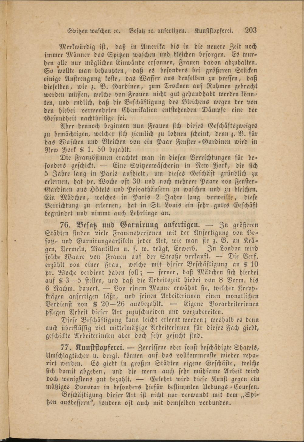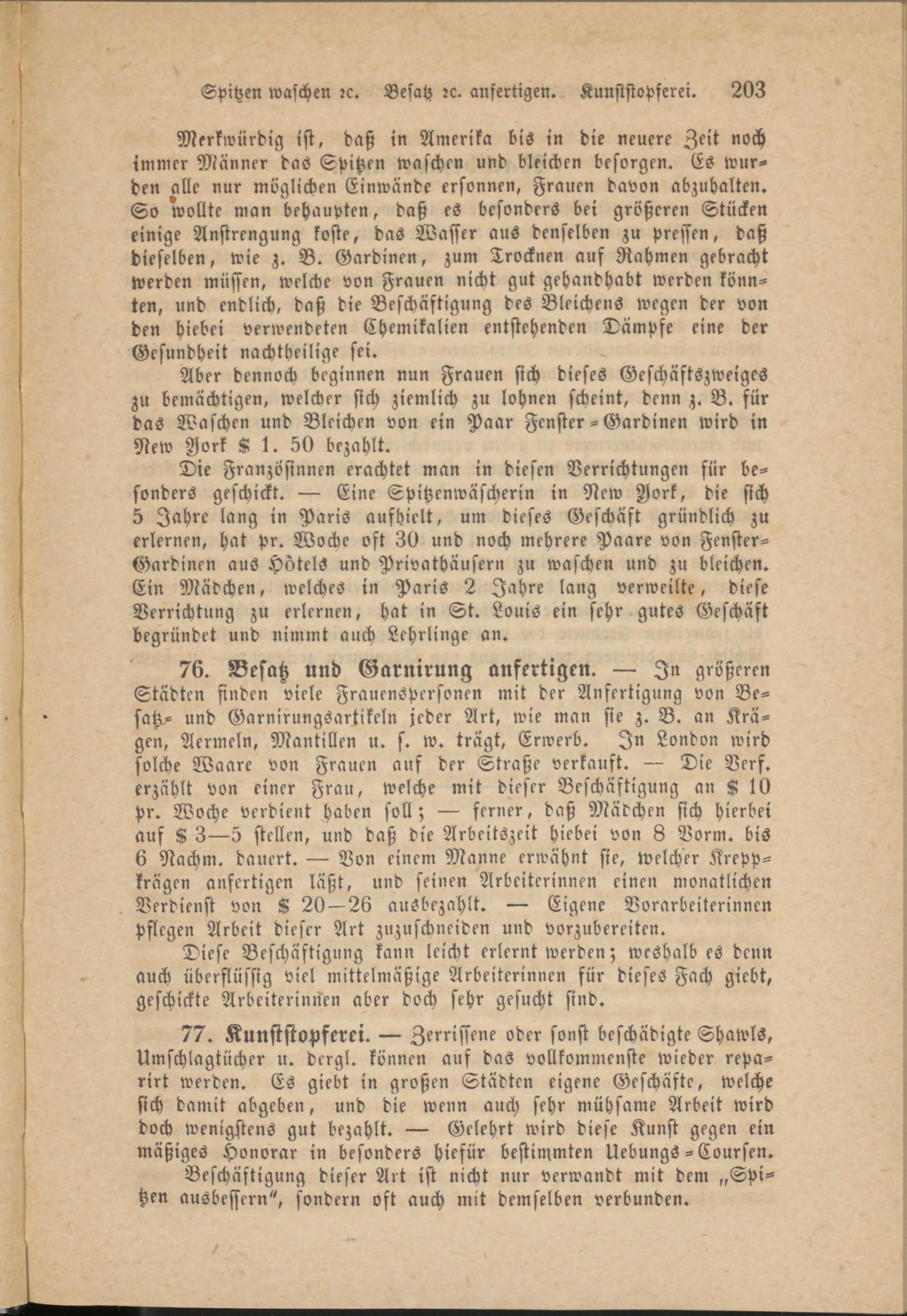 5 Jahre lang in Paris aufhielt, um dieses Geschäft gründlich zu erlernen, hat pr. Woche oft 30 und noch mehrere Paare von Fenster- Gardinen aus Hotels und Privathäusern zu waschen und zu bleichen. Ein Mädchen, welches in Paris 2 Jahre lang verweilte, diese Verrichtung zu erlernen, hat in St. Louis ein sehr gutes Geschäft begründet und nimmt auch Lehrlinge an.