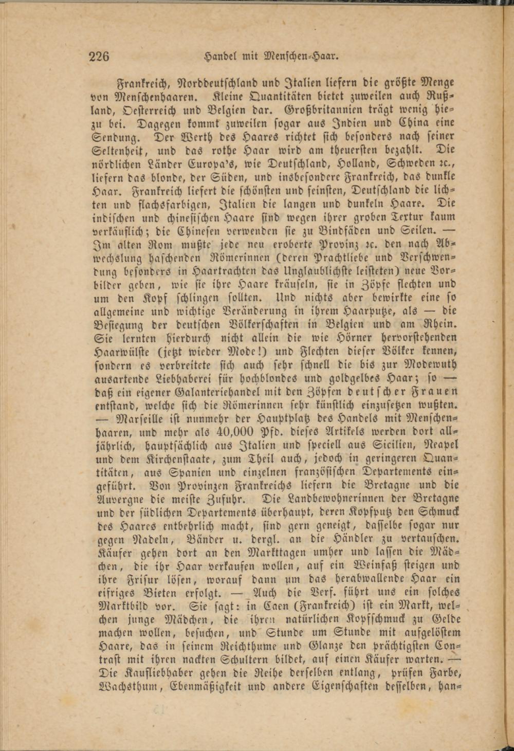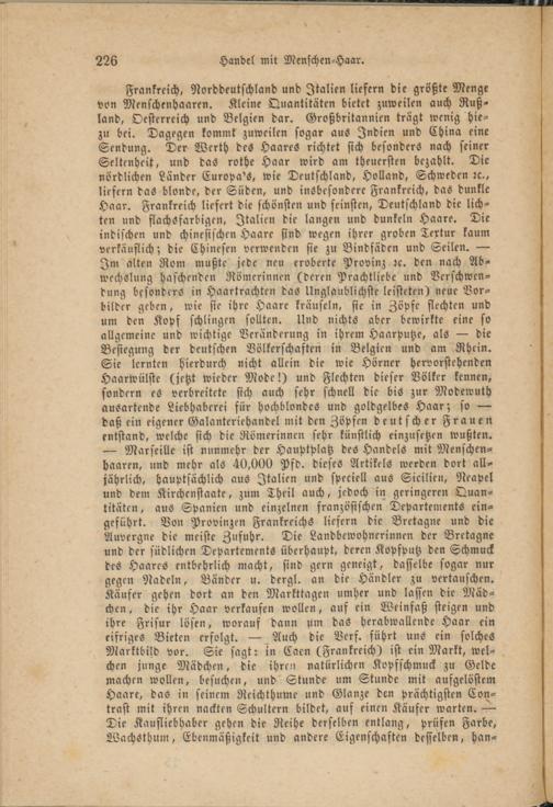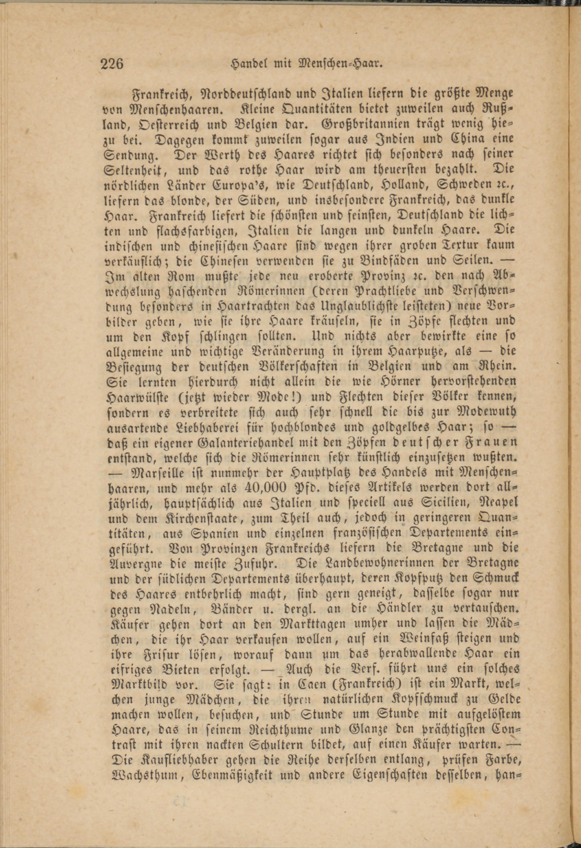 Frankreich, Norddeutschland und Italien liefern die größte Menge von Menschenhaaren. Kleine Quantitäten bietet zuweilen auch Rußland, Oesterreich und Belgien dar. Großbritannien trägt wenig hie- zu bei. Dagegen kommt zuweilen sogar aus Indien und China eine Sendung. Der Werth des Haares richtet sich besonders nach seiner Seltenheit, und das rothe Haar wird am theuersten bezahlt. Die nördlichen Länder Europa's, wie Deutschland, Holland, Schweden rc-, liefern das blonde, der Suden, und insbesondere Frankreich, das dunkle Haar. Frankreich liefert die schönsten und feinsten, Deutschland die lichten und flachsfarbigen, Italien die langen und dunkeln Haare. Die indischen und chinesischen Haare sind wegen ihrer groben Textur kaum verkäuflich; die Chinesen verwenden sie zu Bindfäden und Seilen. — Im alten Rom mußte jede neu eroberte Provinz rc. den nach Abwechslung haschenden Römerinnen (deren Prachtliebe und Verschwendung besonders in Haartrachten das Unglaublichste leisteten) neue Vorbilder geben, wie sie ihre Haare kräuseln, sie in Zöpfe flechten und um den Kopf schlingen sollten. Und nichts aber bewirkte eine so allgemeine und wichtige Veränderung in ihrem Haarputze, als — die Besiegung der deutschen Völkerschaften in Belgien und am Rhein. Sie lernten hierdurch nicht allein die wie Hörner hervorstehenden Haarwülste (jetzt wieder Mode!) und Flechten dieser Völker kennen, sondern es verbreitete sich auch sehr schnell die bis zur Modewuth ausartende Liebhaberei für hochblondes und goldgelbes Haar; so — daß ein eigener Galanteriehandel mit den Zöpfen deutscher Frauen entstand, welche sich die Römerinnen sehr künstlich einzusetzen wußten. — Marseille ist nunmehr der Hauptplatz des Handels mit Menschenhaaren, und mehr als 40,000 Pfd. dieses Artikels werden dort alljährlich, hauptsächlich aus Italien und speciell aus Sicilien, Neapel und dem Kirchenstaate, zum Theil auch, jedoch in geringeren Quantitäten, aus Spanien und einzelnen französischen Departements eingeführt. Von Provinzen Frankreichs liefern die Bretagne und die Auvergne die meiste Zufuhr. Die Landbewohnerinnen der Bretagne und der südlichen Departements überhaupt, deren Kopfputz den Schmuck des Haares entbehrlich macht, sind gern geneigt, dasselbe sogar nur gegen Nadeln, Bänder u. dergl. an die Händler zu vertauschen. Käufer gehen dort an den Markttagen umher und lassen die Mädchen, die ihr Haar verkaufen wollen, auf ein Weinfaß steigen und ihre Frisur lösen, worauf dann um das Herabwallende Haar ein eifriges Bieten erfolgt. — Auch die Verf. führt uns ein solches Marktbild vor. Sie sagt: in Caen (Frankreich) ist ein Markt, welchen junge Mädchen, die ihren natürlichen Kopfschmuck zu Gelde machen wollen, besuchen, und" Stunde um Stunde mit aufgelöstem Haare, das in seinem Reichthum? und Glänze den prächtigsten Con- trast mit ihren nackten Schultern bildet, auf einen Käufer warten. — Die Kaufliebhaber gehen die Reihe derselben entlang, prüfen Farbe, Wachsthum, Ebenmäßigkeit und andere Eigenschaften desselben, han-