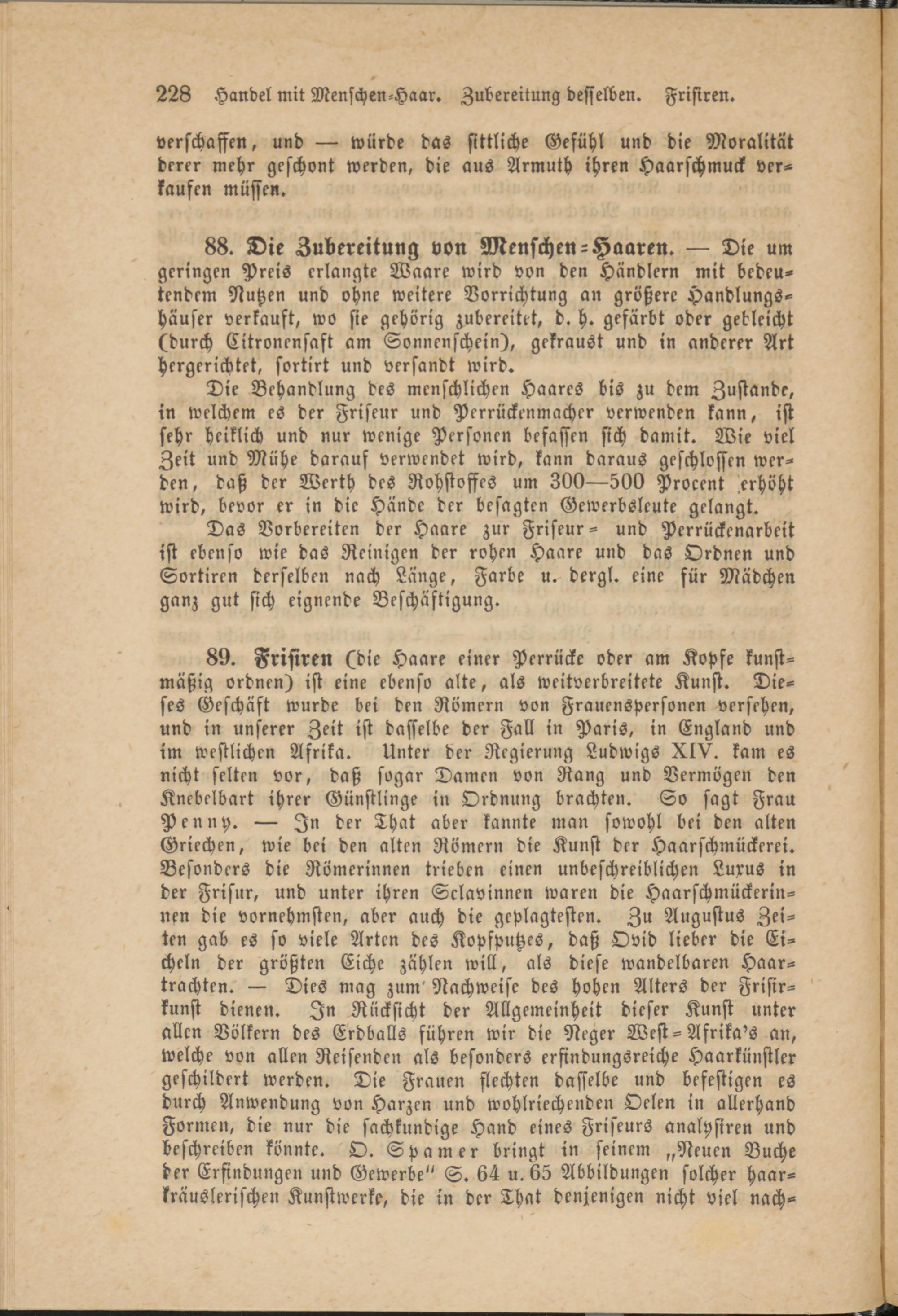 88. Die Zubereitung von Menschen-Haaren. — Die um geringen Preis erlangte Waare wird von den Händlern mit bedeutendem Nutzen und ohne weitere Vorrichtung an größere Handlungshäuser verkauft, wo sie gehörig zubereitet, d. h. gefärbt oder gebleicht (durch Citronensaft am Sonnenschein), gekraust und in anderer Art hergerichtet, sortirt und versandt wird.