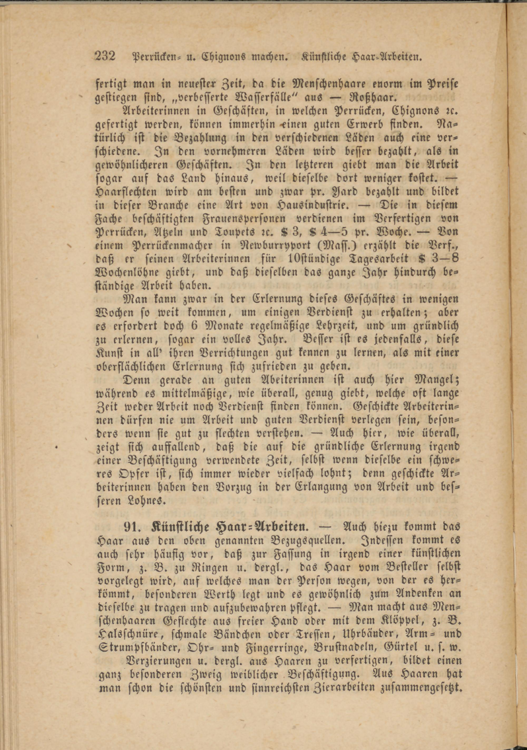 Arbeiterinnen in Geschäften, in welchen Perrücken, Chignons rc. gefertigt werden, können immerhin <inen guten Erwerb finden. Natürlich ist die Bezahlung in den verschiedenen Läden auch eine verschiedene. In den vornehmeren Läden wird besser bezahlt, als in gewöhnlicheren Geschäften. In den letzteren giebt man die Arbeit sogar auf das Land hinaus, weil dieselbe dort weniger kostet. — Haarflechten wird am besten und zwar pr. Aard bezahlt und bildet in dieser Branche eine Art von Hausindustrie. — Die in diesem Fache beschäftigten Frauenspersonen verdienen im Verfertigen von Perrücken, Atzeln und Toupets rc. 8 3, 8 4—5 pr. Woche. — Von einem Perrückenmacher in Newburrpport (Mass.) erzählt die Verf., daß er seinen Arbeiterinnen für lOstündige Tagesarbeit 8 3—6 Wochenlöhne giebt, und daß dieselben das ganze Jahr hindurch beständige Arbeit haben.
