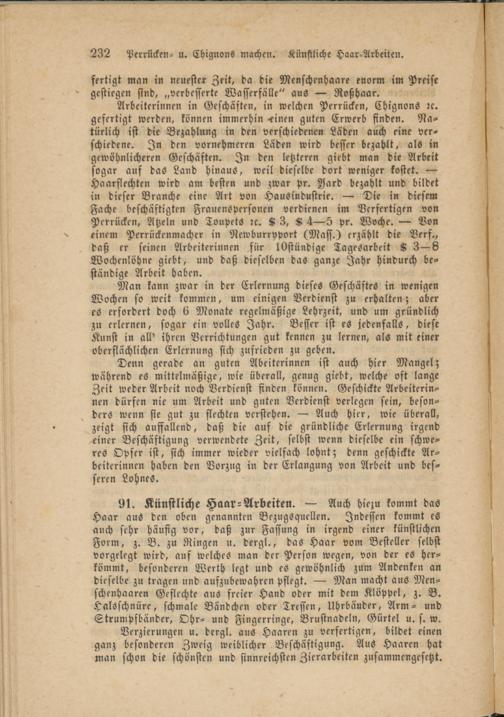 91. Künstliche Haar-Arbeiten. — Auch hiezu kommt das Haar aus den oben genannten Bezugsquellen. Indessen kommt es auch sehr häufig vor, daß zur Fassung in irgend einer künstlichen Form, z. B. zu Ringen u. dergl., das Haar vom Besteller selbst vorgelegt wird, auf welches man der Person wegen, von der es herkömmt, besonderen Werth legt und es gewöhnlich zum Andenken an dieselbe zu tragen und aufzubewahren pflegt. — Man macht aus Men- schenhaaren Geflechte aus freier Hand oder mit dem Klöppel, z. B. Halsschnüre, schmale Bündchen oder Tressen, Uhrbänder, Arm- und Strumpfbänder, Ohr- und Fingerringe, Brustnadeln, Gürtel u. s. w.