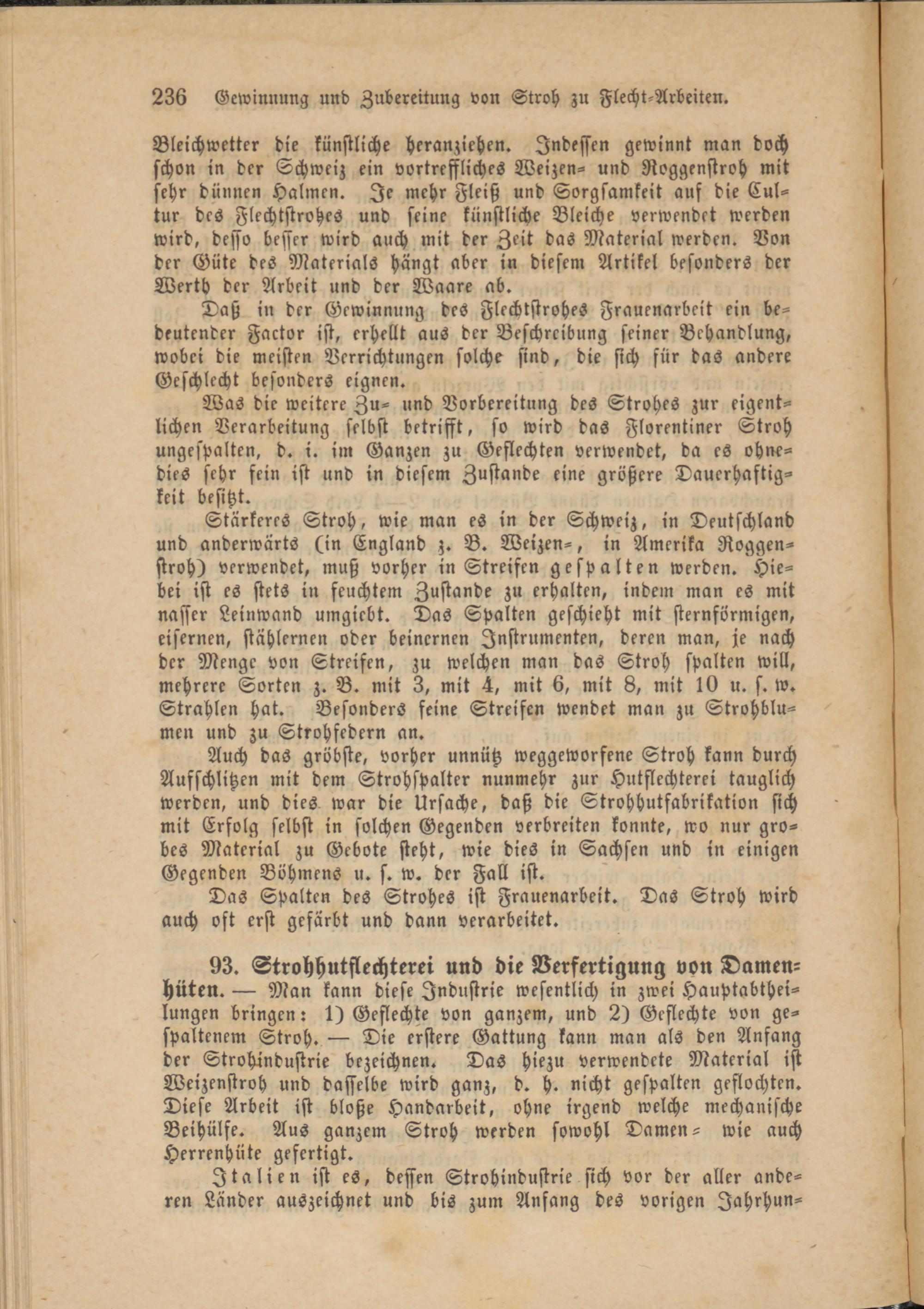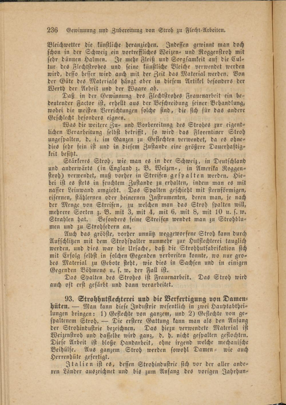 93. Strohhutflechterei und die Verfertigung von Damen- hüten. — Man kann diese Industrie wesentlich in zwei Hauptabtheilungen bringen: 1) Geflechte von ganzem, und 2) Geflechte von gespaltenem Stroh. — Die erstere Gattung kann man als den Anfang der Strohindustrie bezeichnen. Das hiezu verwendete Material ist Weizenstroh und dasselbe wird ganz, d. h. nicht gespalten geflochten. Diese Arbeit ist bloße Handarbeit, ohne irgend welche mechanische Beihülfe. Aus ganzem Stroh werden sowohl Damen- wie auch Herrenhüte gefertigt.