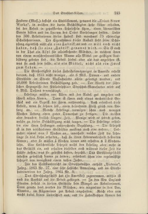 Das Strohhutgeschäft hat (in Amerika) zugenommen, mithin ist auch die Aussicht auf die Arbeit gestiegen. — In den Neu England Staaten besteht in diesem Geschäfte kein Mangel an Arbeiterinnen. Denn gerade dort werden die Mädchen, wie nirgendwo in den Ver. Staaten, im Allgemeinen zur Arbeit angehalten. Reich oder arm macht dabei keinen Unterschied aus, und die Fabrikbesitzer können bei