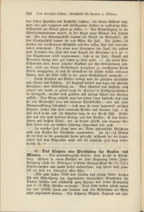 95. Das Flechten von Strohhüten für Knaben und Männer. — Der würtembergische Consul, Herr Hecht in Straßburg, schildert in einem Berichte an seine Regierung diesen Industriezweig (siehe Dr. B öttge r's Polyt. Notizen-Blatt Nr.21, XXI) folgendermaßen und macht Hiebei aufmerksam, daß hierin noch ziemlich ein Feld der Thätigkeit offen stehe.