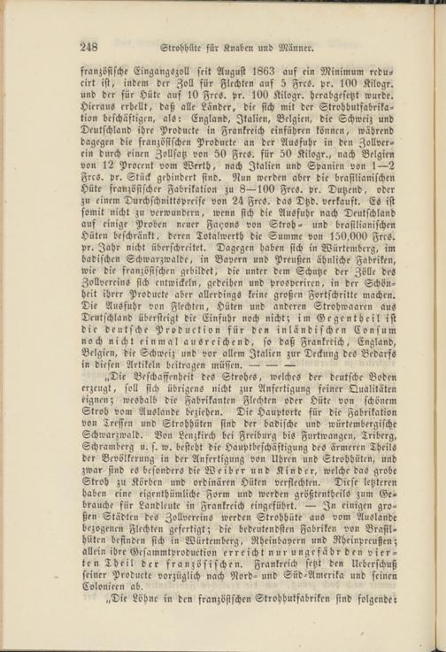 „Die Beschaffenheit des Strohes, welches der deutsche Boden erzeugt, soll sich übrigens nicht zur Anfertigung feiner Dualitäten eignen; weshalb die Fabrikanten Flechten oder Hüte von schönem Stroh vom Auslande beziehen. Die Hauptorte für die Fabrikation von Treffen und Strohhüten sind der badischc und würtembergische Schwarzwald. Von Lenzkirch bei Freiburg bis Furtwangen, Triberg, Schramberg u. s. w. besteht die Hauptbeschäftigung des ärmeren Theils der Bevölkerung in der Anfertigung von Uhren und Strohhüten, und zwar sind es besonders die Weiber und Kinder, welche das grobe Stroh zu Körben und ordinären Hüten verflechten. Diese letzteren haben eine eigenthümliche Form und werden größtentheils zum Gebrauche für Landleute in Frankreich eingeführt. — In einigen großen Städten des Zollvereins werden Strohhüte aus vom Auslande bezogenen Flechten gefertigt; die bedeutendsten Fabriken von Brasilhüten befinden sich in Würtemberg, Rheinbayern und Rheinprcußen; allein ihre Gesammtproduction erreicht nur ungefähr den vierten Theil der französischen. Frankreich setzt den Ueberschuß seiner Produkte vorzüglich nach Nord- und Süd-Amerika und seinen Colonicen ab.