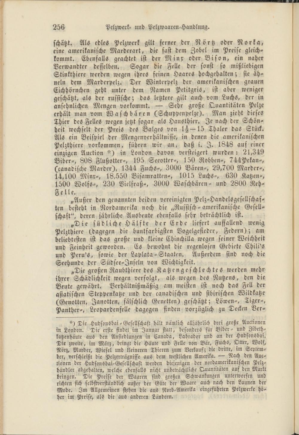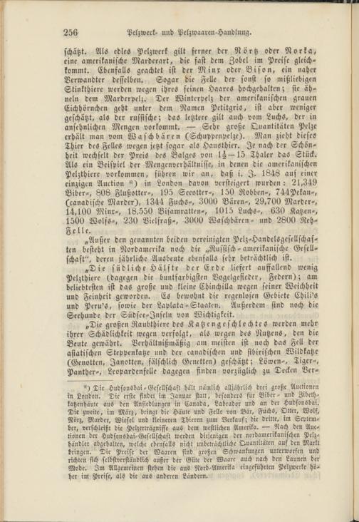 schätzt. Als edles Pelzwerk gilt ferner der Nörtz oder Norka, eine amerikanische Mardcrart, die fast dem Zobel im Preise gleichkommt. Ebenfalls geachtet ist der Minx oder Bison, ein naher Verwandter desselben. Sogar die Felle der sonst so mißliebigen Stinkthiere werden wegen ihres feinen Haares hochgehalten; sie ähneln dem Marderpelz. Der Wintcrpelz der amerikanischen grauen Eichhörnchen geht unter dem Namen Petitgris, ist aber weniger geschätzt, als der russische; das letztere gilt auch vom Luchs, der in ansehnlichen Mengen vorkommt. — Sehr große Quantitäten Pelze erhält man vom Waschbären (Schuppenpelze). Man zieht dieses Thier des Felles wegen jetzt sogar als Hausthier. Je nach der Schönheit wechselt der Preis des Balges von 1^ — 15 Thaler das Stück. Als ein Beispiel der Mengenverhältnisse, in denen die amerikanischen Pelzthiere vorkommen, führen wir an, daß i. I. 1848 auf einer einzigen Auction ^) in London davon versteigert wurden: 21,349 Biber-, 808 Flußotter-, 195 Seeotter-, 150 Robben-, 744Pekan-, (canadische Marder), 1344 Fuchs-, 3000 Bären-, 29,700 Marder-, 14,100 Minr-, 18,550 Bisamratten-, 1015 Luchs-, 630 Katzen-, 1500 Wolfs-, 230 Vielfraß-, 3000 Waschbären- und 2800 Neh- Felle.
