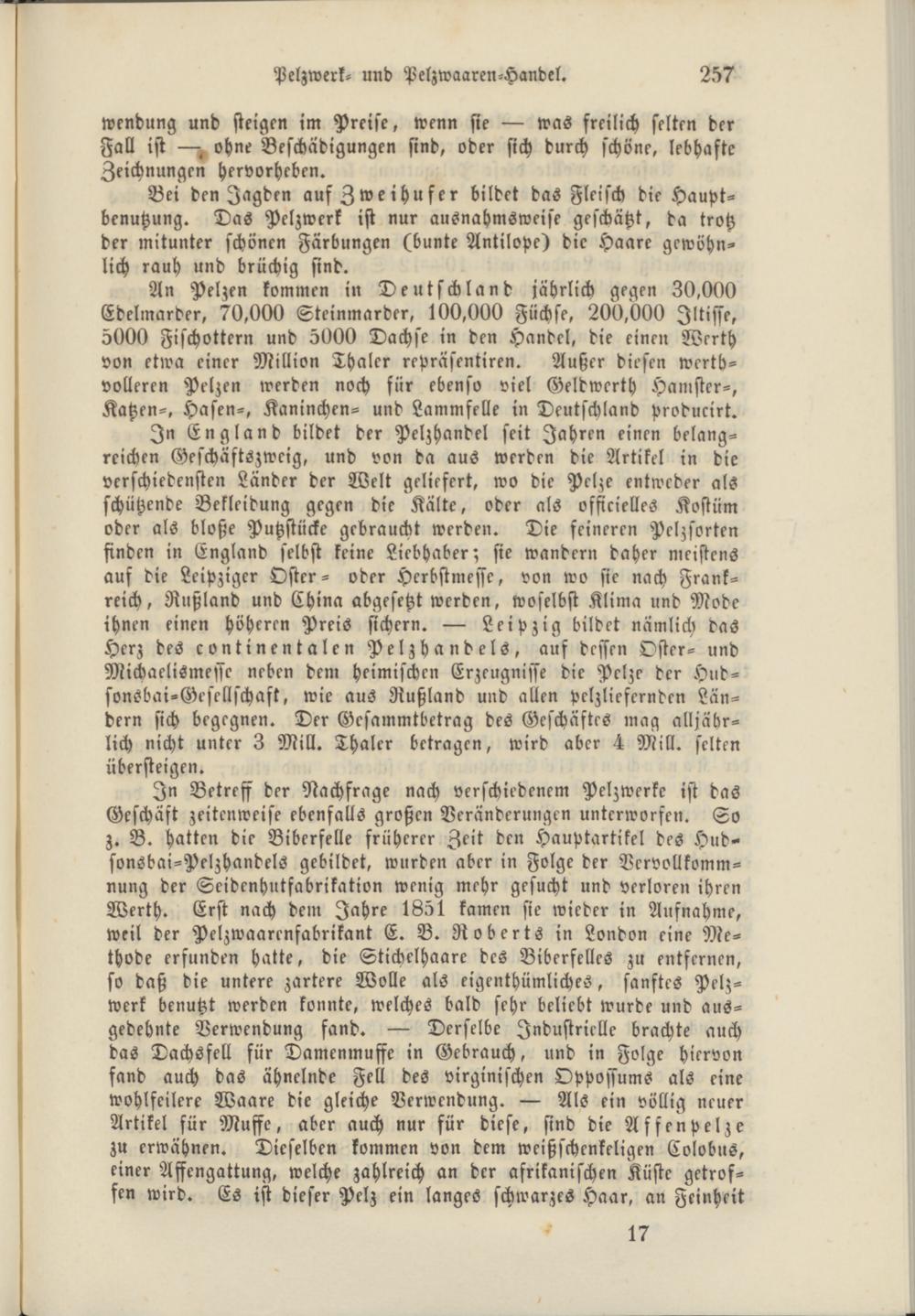 An Pelzen kommen in Deutschland jährlich gegen 30,000 Edelmarder, 70,000 Steinmarder, 100,000 Füchse, 200,000 Iltisse, 5000 Fischottern und 5000 Dachse in den Handel, die einen Werth von etwa einer Million Thaler repräsentiren. Außer diesen werth- volleren Pelzen werden noch für ebenso viel Geldwerth Hamster-, Katzen-, Hasen-, Kaninchen- und Lammfelle in Deutschland producirt.