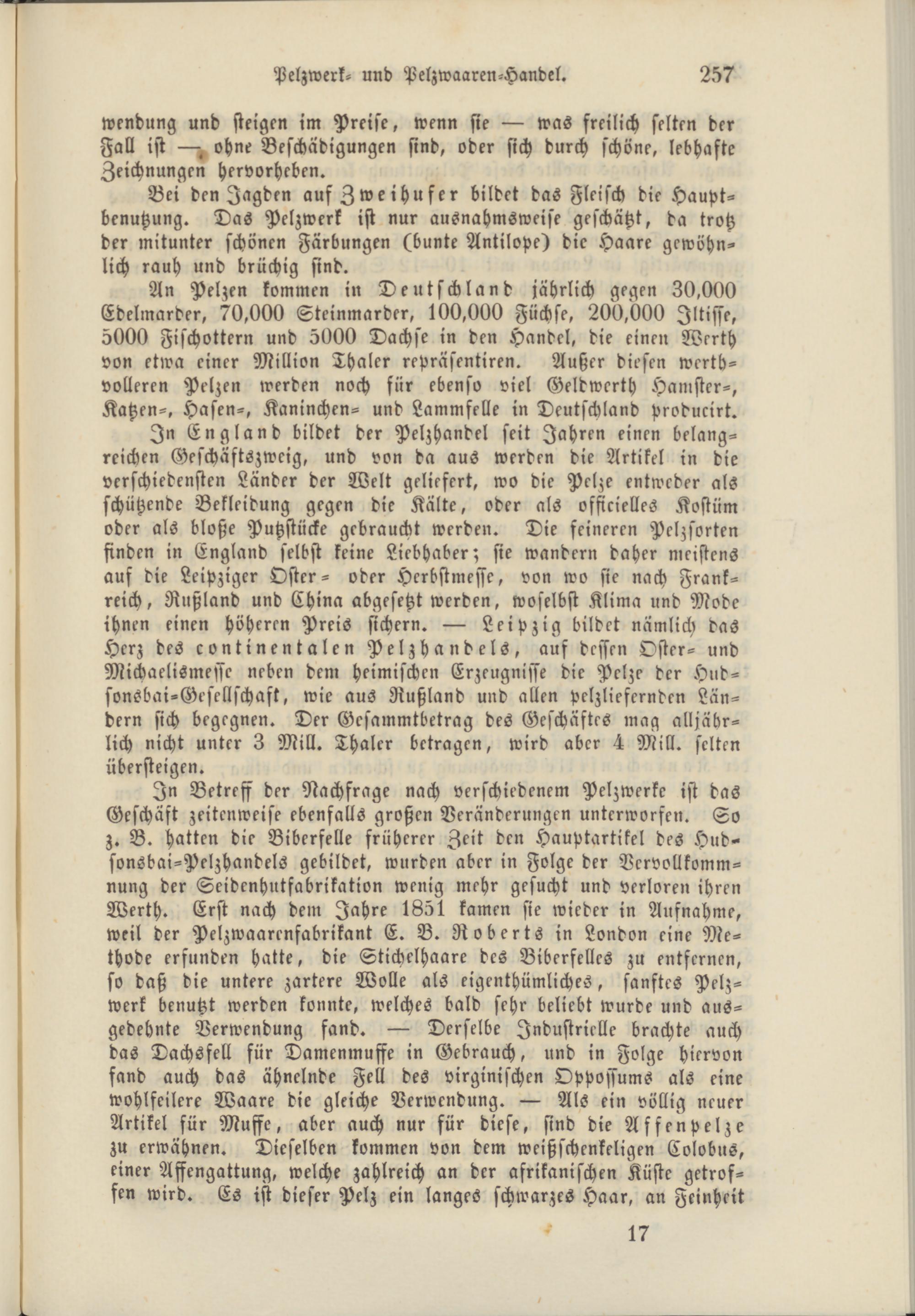 In England bildet der Pelzhandel seit Jahren einen belangreichen Geschäftszweig, und von da aus werden die Artikel in die verschiedensten Länder der Welt geliefert, wo die Pelze entweder als schützende Bekleidung gegen die Kälte, oder als officielles Kostüm oder als bloße Putzstücke gebraucht werden. Die feineren Pelzsorten finden in England selbst keine Liebhaber; sie wandern daher meistens auf die Leipziger Öfter- oder Herbstmesse, von wo sie nach Frankreich, Rußland und China abgesetzt werden, woselbst Klima und Mode ihnen einen höheren Preis sichern. — Leipzig bildet nämlich das Herz des c o n t i n e n t a l e n Pelzhandels, auf dessen Öfter- und Michaelismeffc neben dem heimischen Erzeugnisse die Pelze der Hud- sonsbai-Gesellschaft, wie aus Rußland und allen pelzlieferndcn Ländern sich begegnen. Der Gcsammtbetrag des Geschäftes mag alljährlich nicht unter 3 Mill. Thaler betragen, wird aber 4 Milk. selten übersteigen.