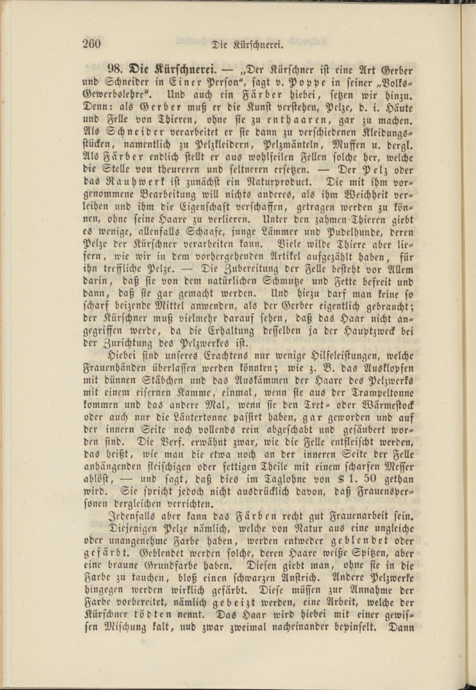 Diejenigen Pelze nämlich, welche von Natur aus eine ungleiche oder unangenehme Farbe haben, werden entweder geblendet oder gefärbt. Geblendet werden solche, deren Haare weiße Spitzen, aber eine braune Grundfarbe haben. Diesen giebt man, ohne sie in die Farbe zu tauchen, bloß einen schwarzen Anstrich. Andere Pelzwerke hingegen werden wirklich gefärbt. Diese müssen zur Annahme der Farbe vorbereitet, nämlich gebeizt werden, eine Arbeit, welche der Kürschner tödten nennt. Das Haar wird Hiebei mit einer gewissen Mischung kalt, uud zwar zweimal nacheinander bepinselt. Dann